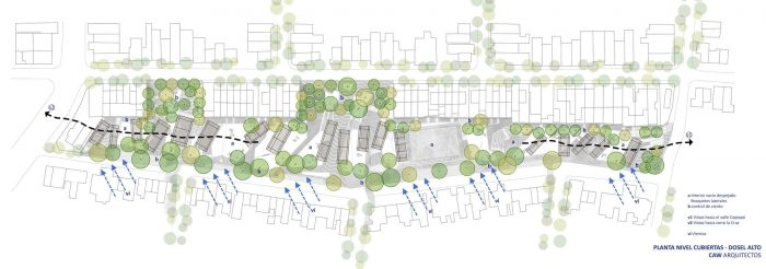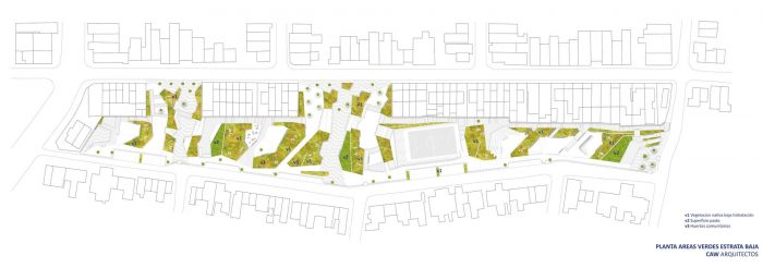 In this way, the park is composed of a delicate social and ecological fabric between zones of high vegetation cover, intermediate zones of lower vegetation, orchards, and more exposed programmatic zones (with pavements). With this strategy large heat islands are avoided, always trying to be "surrounded by the green".
