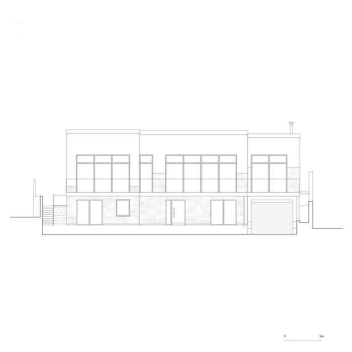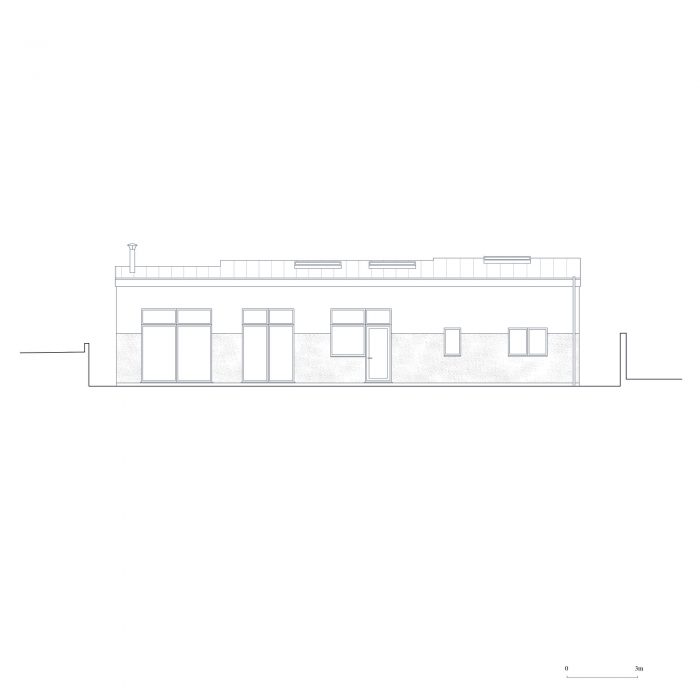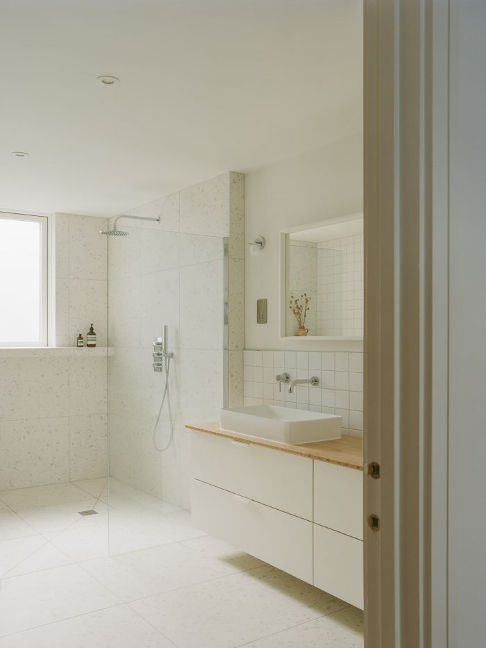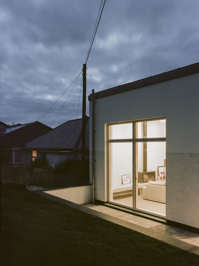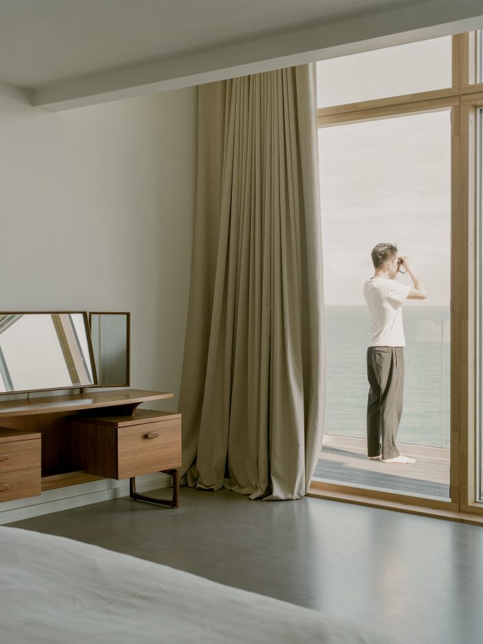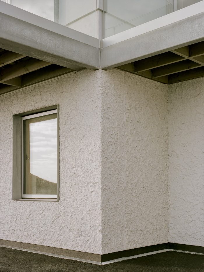 The house has a single-pitch zinc roof, untainted and bright-rolled. Paying homage to the former roofline, the facade is demarcated by a staggering horizontal ‘plimsoll’ line. It separates the roughcast render at lower levels from the smooth render above. Monolithic and modest in material, the textured lime rendered with silver metals intends to be a refinement of British seaside architecture.