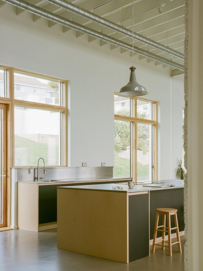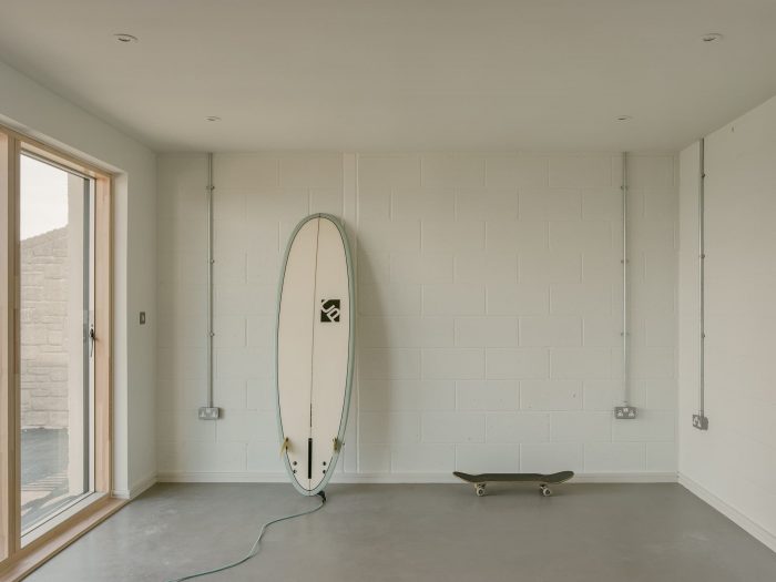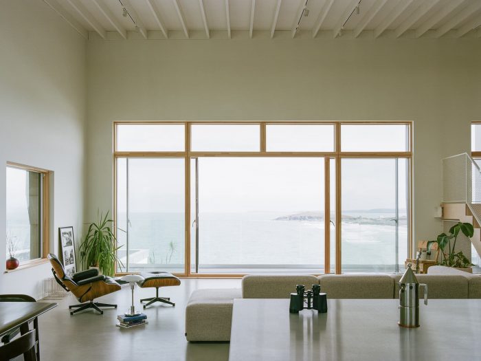 On the serrated coastline of Fistral Bay, a new residence sits on top of a tiered terrace garden on the cliffs of Esplanade Road. As the clients’ home and workspace, the three-story building is a project in being inventive with a minimal palette.