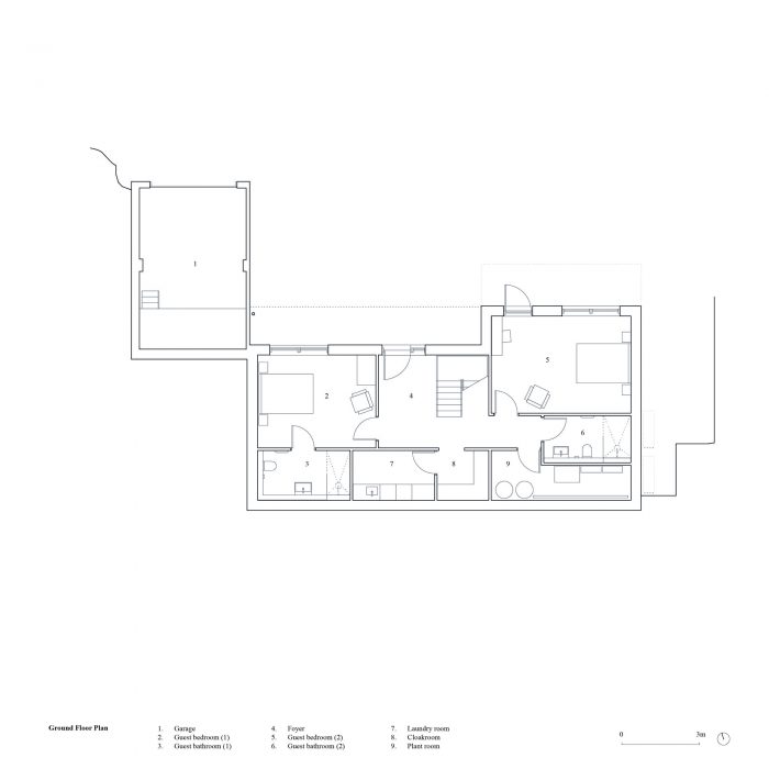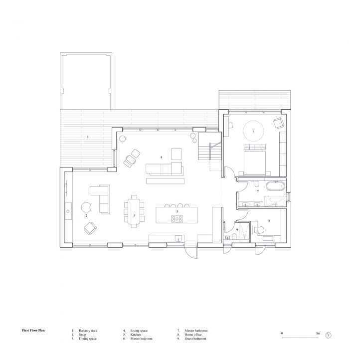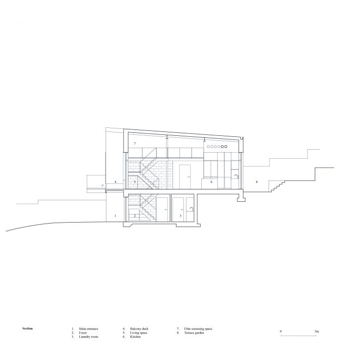 倾斜的地形影响了场地的平面设计。雕塑般的胶合板楼梯从底层通向楼上的主要生活空间,带来自然光和连接。长长的钢梁与裸露的檐口使4米高的居住空间周围的景色一览无余,从海的地平线到朝南的后花园的草坪。带屋顶灯的放映室和图书馆在顶层提供了一个阅读和放松的亲密环境。