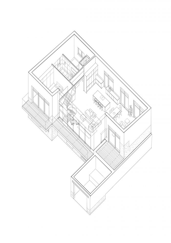 这座房子有一个单坡度的锌屋顶,没有被污染,而且是明亮的轧制。为了向以前的屋顶线致敬,外墙被一条惊人的水平 "plimsoll "线所分割。它将低层的毛坯房和上面的光滑的泥浆房分开。整体性和适度的材料,有质感的石灰与银色金属的渲染,意在成为英国海滨建筑的精髓。