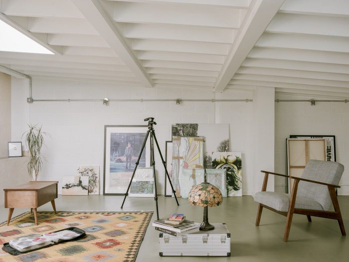 The sloping terrain informs the floorplan of the site. The sculptural plywood stairs leading from the ground floor bring natural light and connection to the main living space upstairs. Long steel beams with an exposed soffit allow for unobstructed views around the 4m-high living space, and from the horizon of the sea to the lawn of the south-facing back garden. The screening room and library with a roof light offer an intimate setting to read and relax on the top floor.