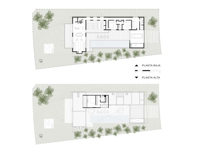 That is to say that the slope of the dune between two neighboring lots was an atypical feature that we decided to respect and play a leading role in. We generated a first floor with a patio typology that opens on its side to this ravine as a fourth facade of the space. We understood that it was not worth forcing the project or the lot to reach the height of implantation of the neighbor.