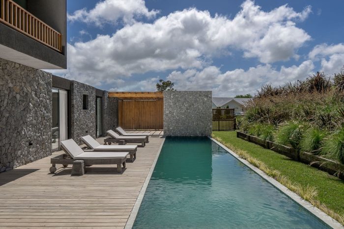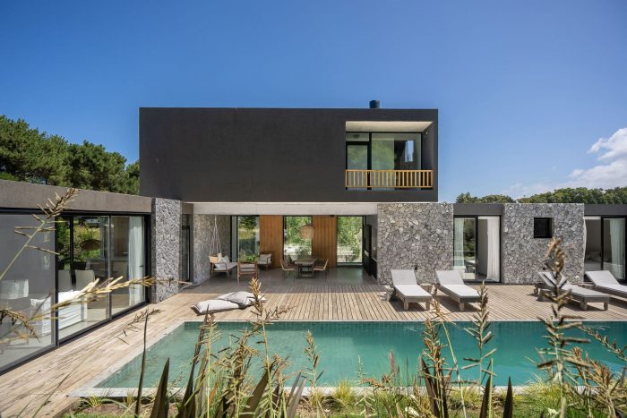 There is no entrance door, one opens the gate from the street and passes through a first semi-covered roof space (a garage that hides behind its wooden walls an invisible service area) and completely covered in wood, and one discovers the courtyard, the heart of the project. A 16-meter-long pool, made of concrete and volcanic stone, accompanies and guides the user's procession through a wooden deck to the interior of the house.