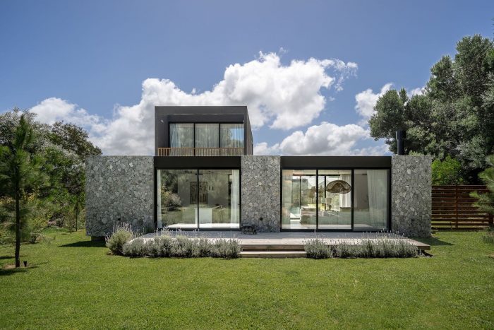 The materials chosen were stone for the first floor façade, graphite-colored plaster for the upper floor, black DVH windows, wood for exterior floors and semi-covered walls, exposed concrete for ceilings and smoothed concrete for interior floors and bathroom walls. All bathrooms are illuminated by skylights.