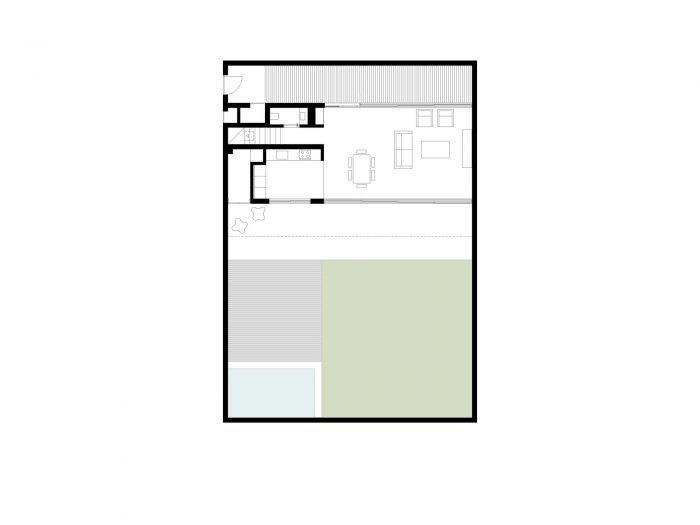 每个单元有两层楼。公共区域位于一楼,有一个宽敞的厨房和客厅区。根据房屋类型,客厅直接通向一个或两个门廊,在房屋内部和外部区域之间形成一种关系。窗户的框架和它的深度开口允许与外部几乎完全连接,加强了这种关系。沿着房子的门廊是一个带有遮阳的外部休息区,保护房子的内部免受阳光直射和偶尔的雨水。