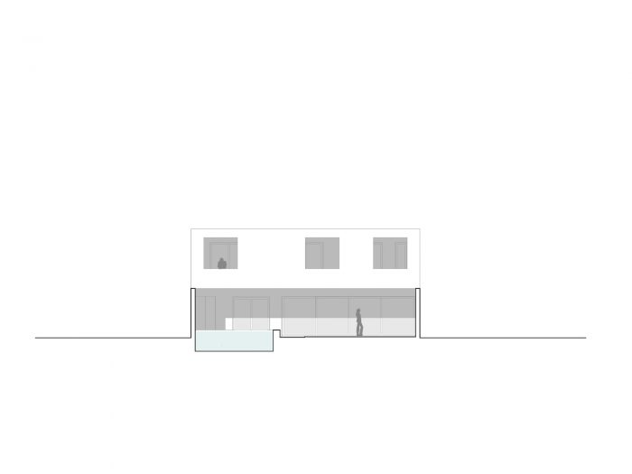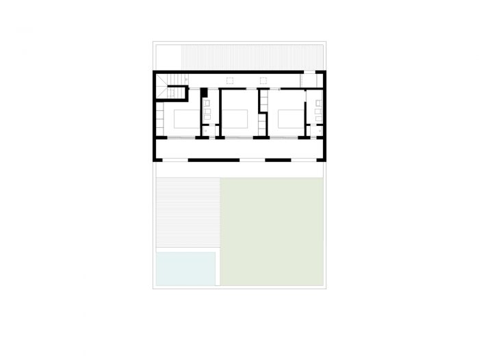 In the upper floor, is the private area of the house, with the bedrooms and the two bathrooms. The bedrooms and the bathrooms open to a balcony, protected from direct sunlight, creating a relation with the surroundings and the sea.