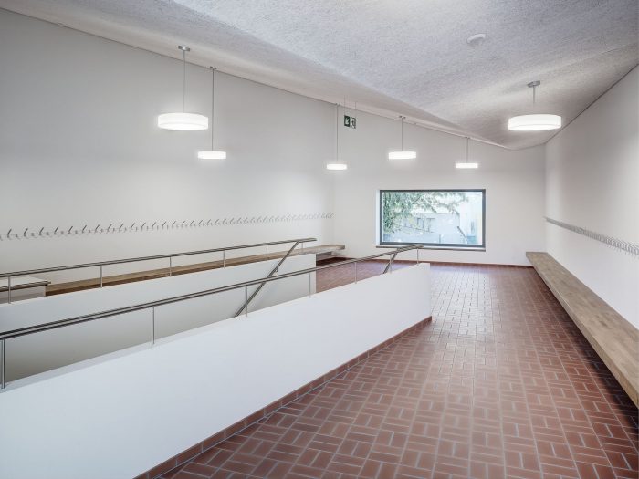 On the ground floor, the dayschool and the multi-purpose room are accommodated with the adjoining rooms. The dayschool is characterized by an open space design, whereby the rooms can be divided according to needs. The main rooms have a two-sided exposure, on the one hand to the court and the northern playground.