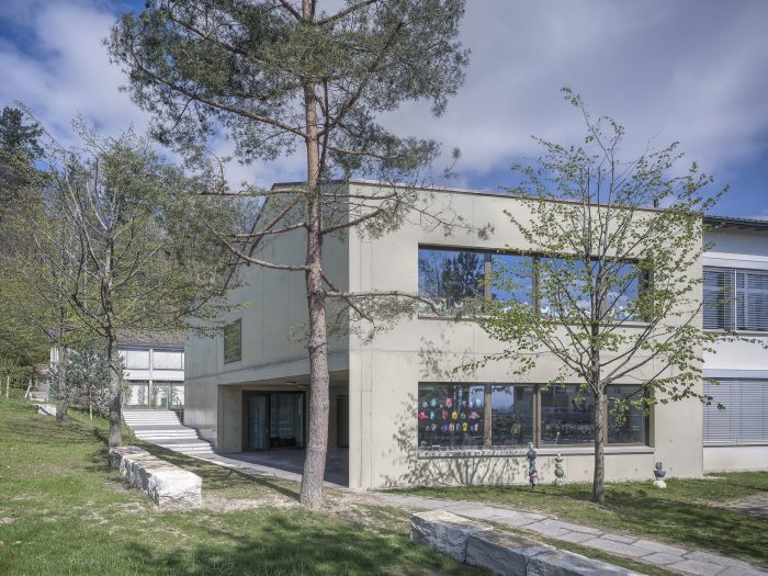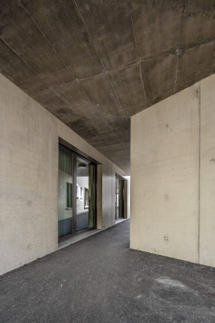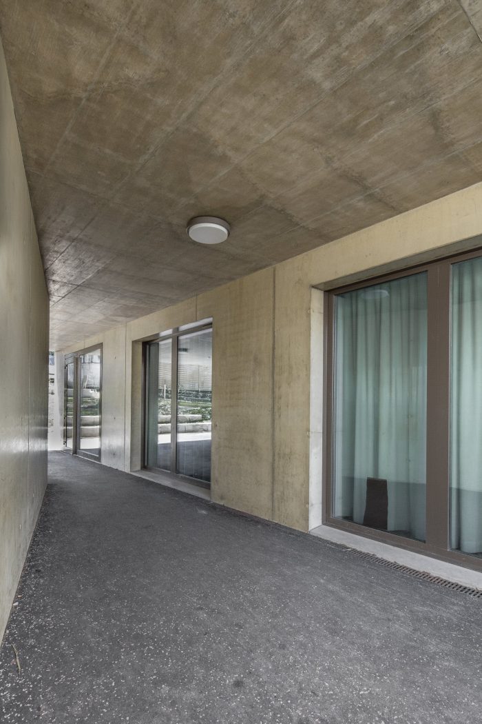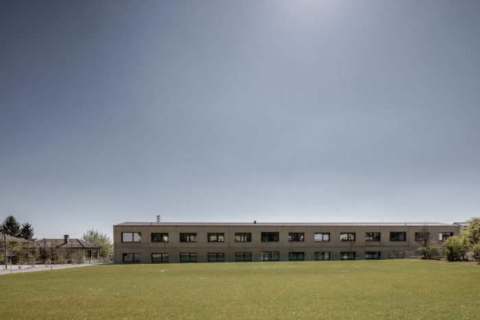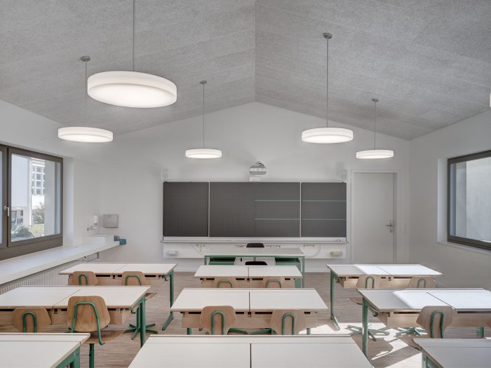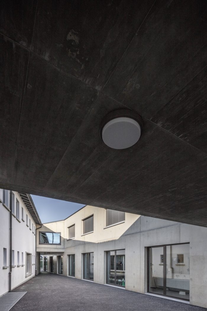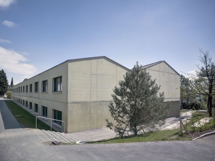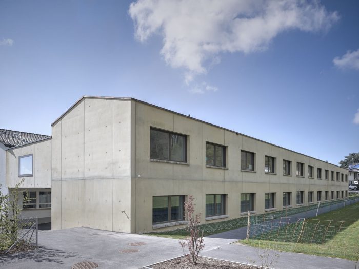The facades are equipped with additive windows with an adequate restraint. The visible concrete construction takes over the existing yellow colour from the neighbouring school buildings.