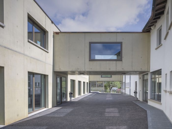 The new building is developed from the old building. Due to the given interior structure of the old building, three connection points are created. Thanks to the passerelles between old and new buildings, the school building works as a whole. The passerelles generate covered outside areas, which also define the inputs.