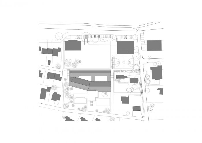 城市图强烈地提到了现有的建筑群。一座两层楼的建筑被放置在现有校舍的后面。它在最窄的地方与学校相连。这创造了一个拉长的法庭,为学校创造了一个大气的会议、居住和交流空间。
