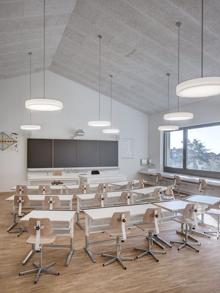 The corridors are complemented in important circulation areas with spacious open zones. The accommodation and working spaces of the teaching staff are located in the existing building on the southeast side. The central location next to the entrance area ensures short distances, a good overview of the area and thus a simple school operation.