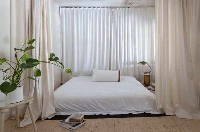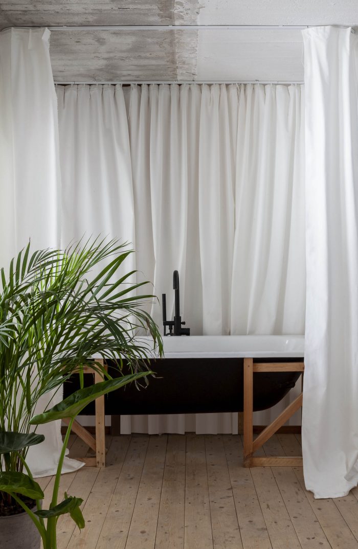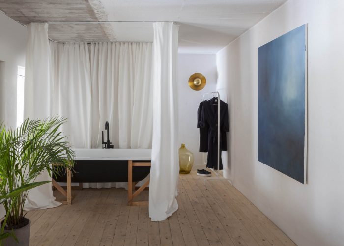 On the mezzanine level, hardwood flooring and white curtains soften the starkness of the exposed concrete surfaces while a free-standing bathtub, cheekily suspended on timber supports, further stokes the dialogue between the hand-crafted and mass-produced that runs through the project – a fitting discourse for a studio housing the practices of both an artist and a designer.
