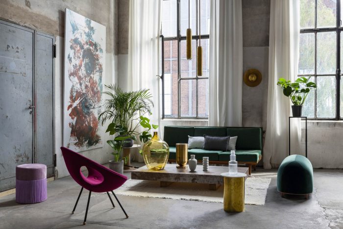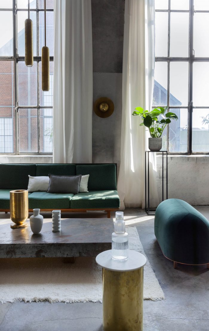 The space is sparsely furnished with a selection of Jan’s designs as well as vintage pieces such as the ‘Tatra’ sofa mass-produced in Czechoslovakia in the 1950s. Predominantly made of brass and channeling a pre-war, Art Deco aesthetic, Jan’s pendant, desk, and wall lamps add accents of opulence and refinement into the studio’s otherwise industrial starkness, while their hand-crafted quality echoes the human labor that once filled the premises.