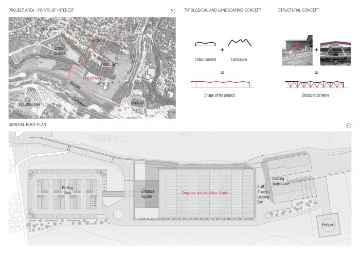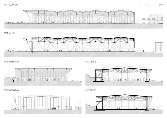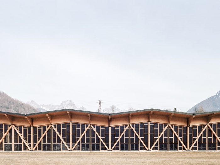 The project looks at Agordo’s typical landscape and urban morphology to create a new language. The structure is characterized by a repeated pitched roof which draws a recognizable sign through the landscape from South to North.