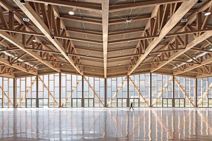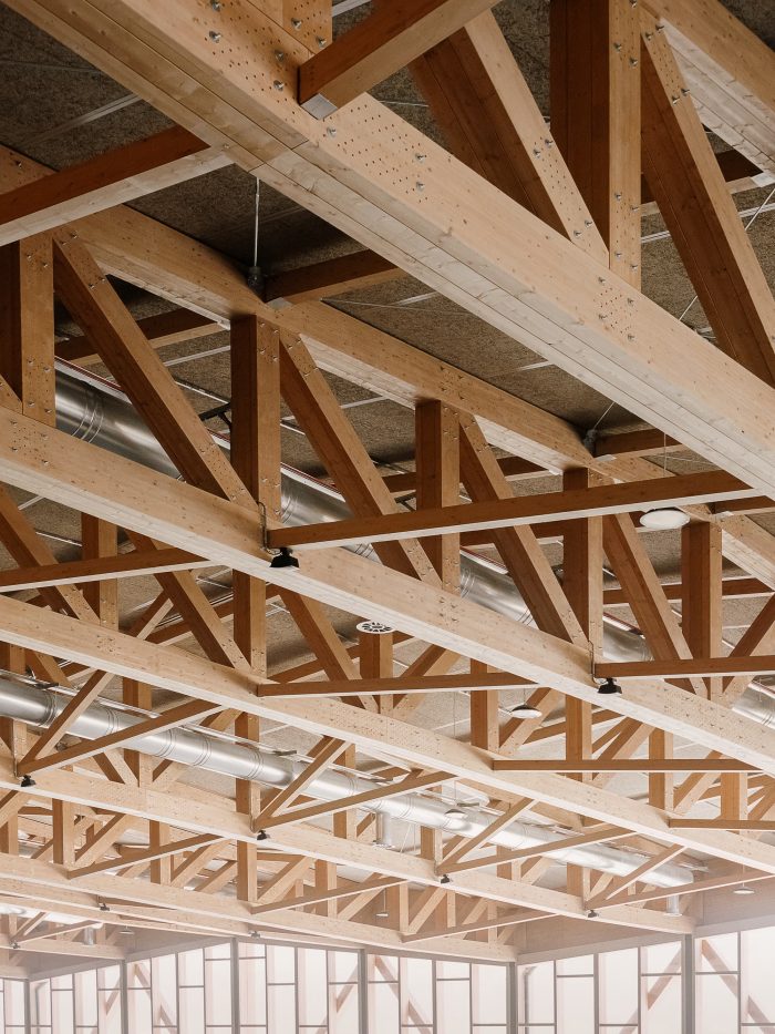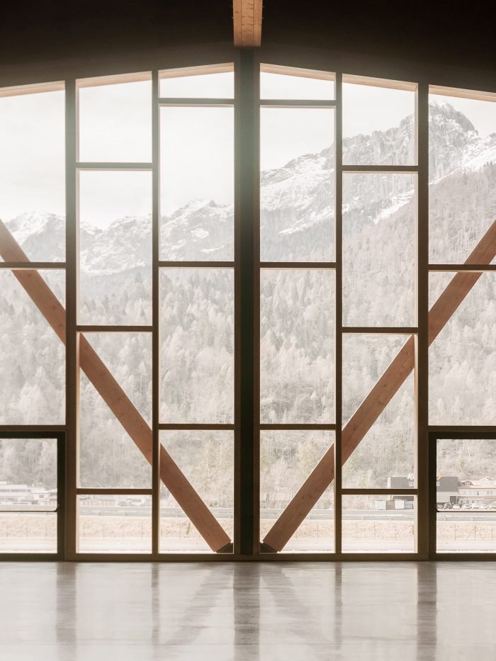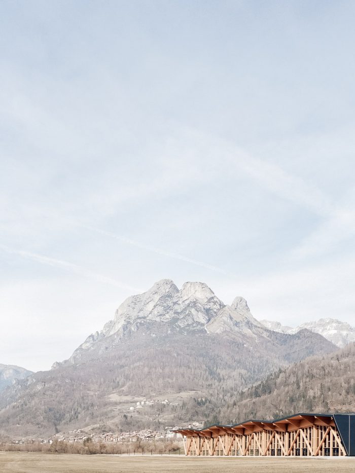 The complex has been designed taking inspiration from the typical constructions of the alpine valleys (tabià), with wooden frame and cross bracing elements. The supporting structure has been conceived in timber, both for environmental compatibility and consistency with the Alpine building tradition, from which it draws inspiration.