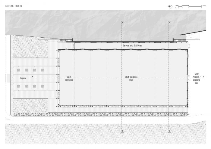 The North and West facades are designed to be large clear glass curtain walls facing to the landscape, in order to allow the contemplation of the mountains from the main hall. The East and South elevations are instead blind and oriented respectively towards a sloping green area and the lading bay.