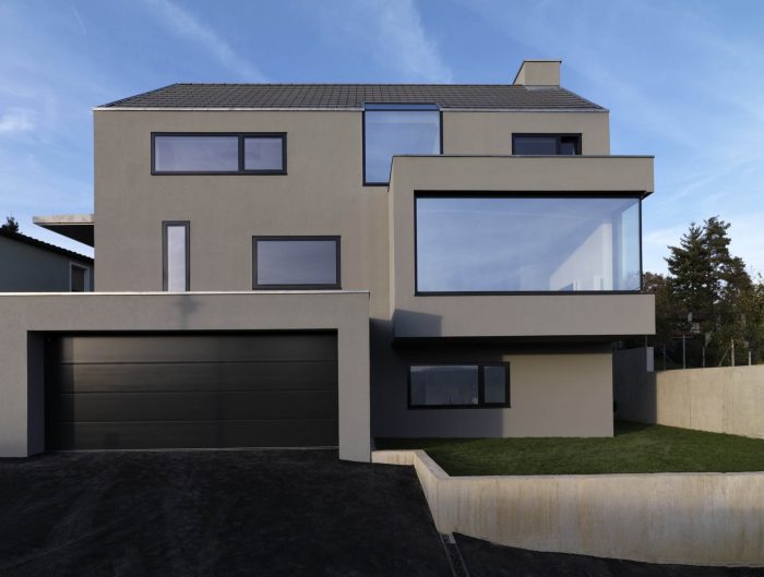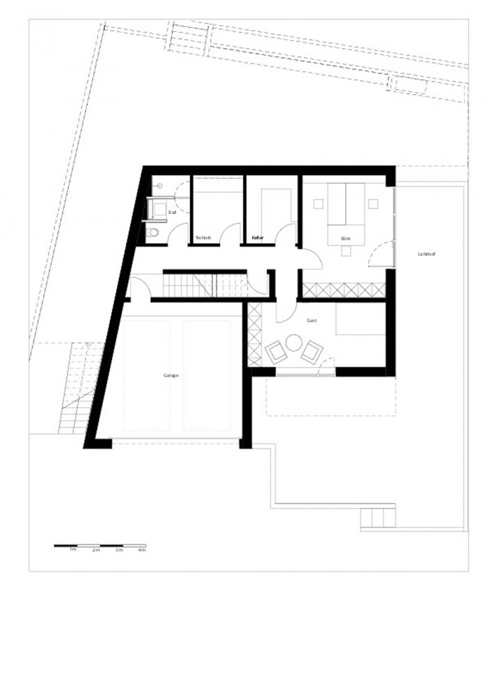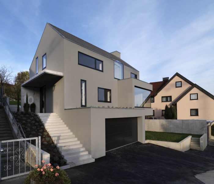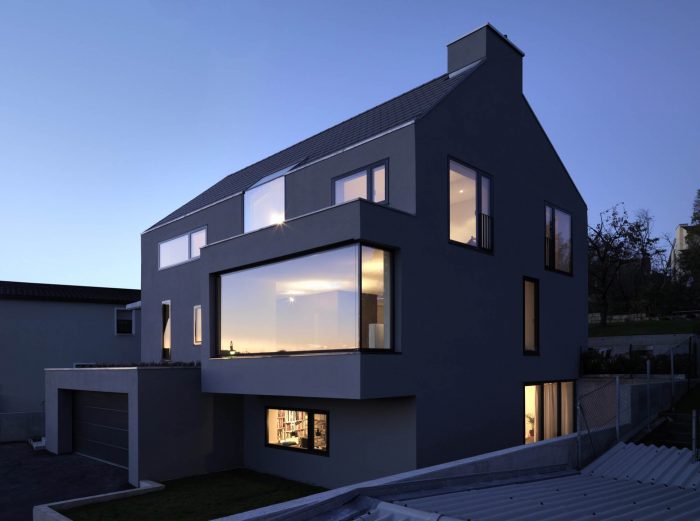 The large Windows open up the massive building, which initially seems quite closed, and allow views in and out from every aspect. Projecting parts of the building such as Windows and garage, bring a rhythm to the facade and playful elements into the severe architecture. The projecting glass structure provides the living room with the necessary generous space, without increasing the total area of the house and therefore the building costs.