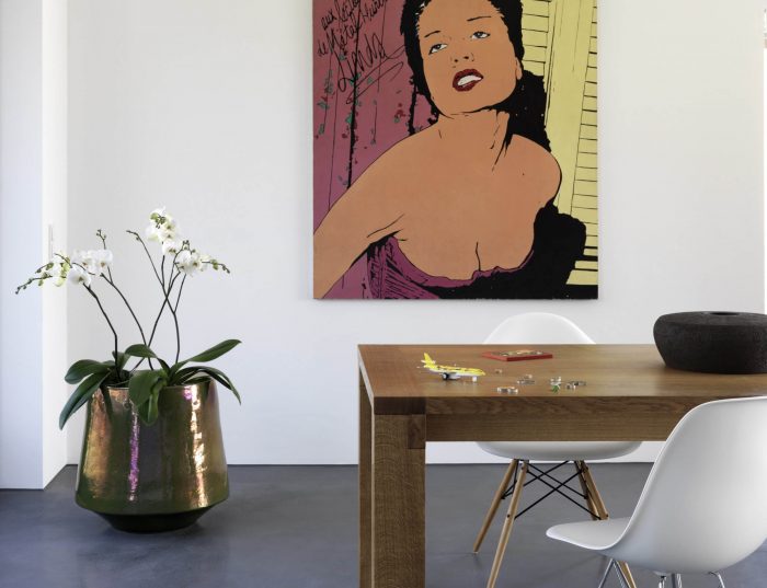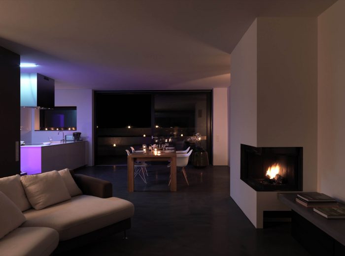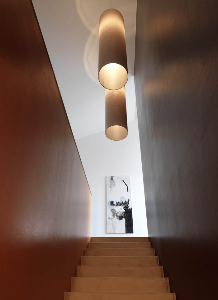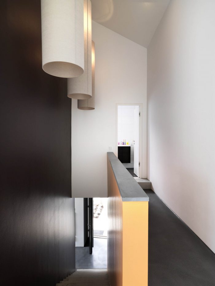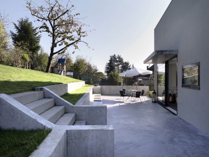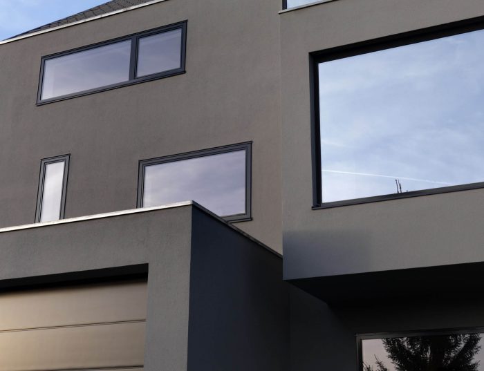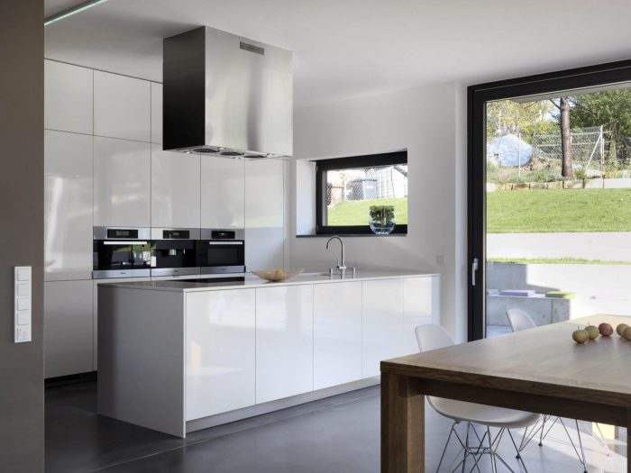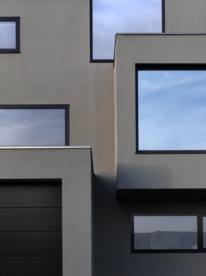The facade is plastered smooth grey. The tiled roof continues this colour and the building appears to be of one piece. Gutters and down pipes have been concealed. The anthracite co-loured aluminium framed Windows, Hush with the facade, modelled on Swiss design create a smooth, homogenous appearance. Cooking, eating and living area flow into one without the interruption of supports or walls. The stairs form the core of the main living area, connecting the three floors and the various living areas. The kitchen faces the garden and opens on to the dining and living room. Adjacent is a Utility room.
