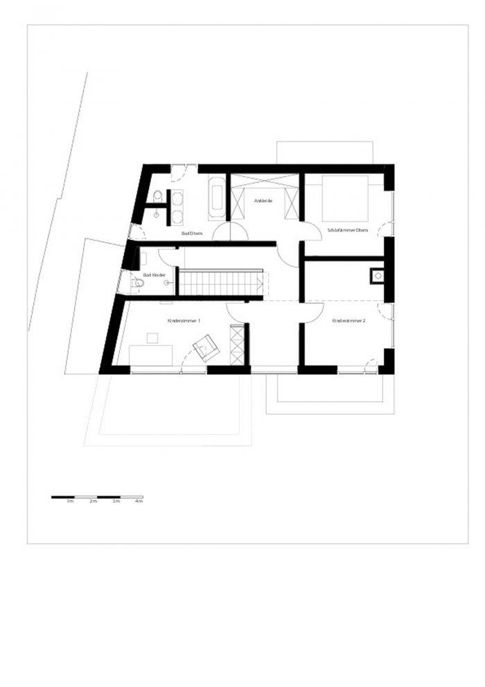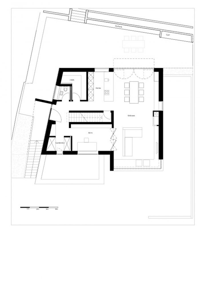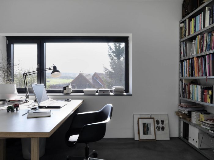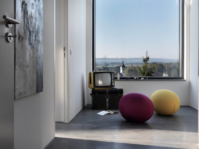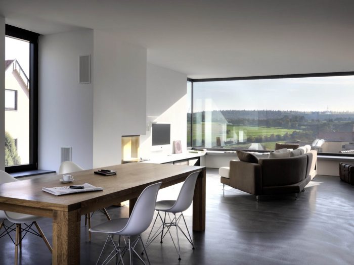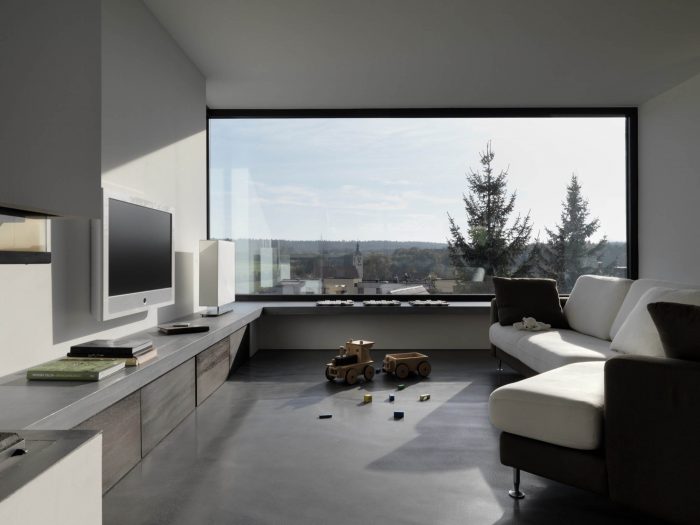 The view from the L-shaped panoramic window over the 900 year old village of Denkendorf, with its abbey in the centre, attracts everyone's attention. The heated window ledge of fair-faced concrete is therefore the most popular seat in the house. Clearly defined, minimalist in its form and material, the trapeze shaped three floor residential and office premise may appear cool at first glance.