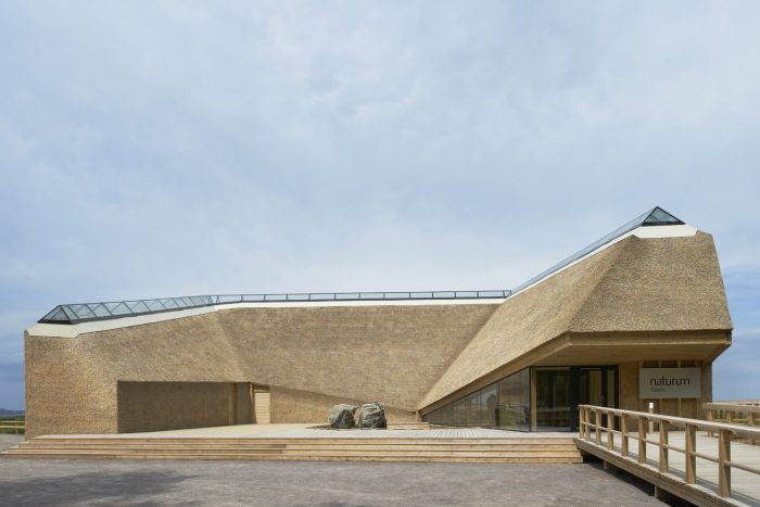 All the way out where the forest ends and the reeds begin, a visitor center hovers low on piles set carefully into the water’s edge. The building is clad in thatch, camouflaged like a birdwatcher’s blind, hiding its contents from the natural world that surrounds it. This is quiet architecture, using traditional local materials to break new ground with its crystalline geometry. Steep roofs transition seamlessly into walls. The steep pitch gives them longevity. The ridge, where a thatched roof is most vulnerable, is transformed into a glazed skylight.