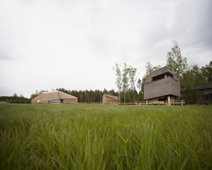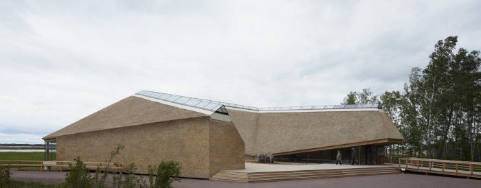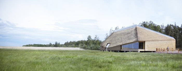 在森林结束和芦苇开始的所有地方,一个游客中心低低地盘旋在精心设置在水边的桩上。建筑物用茅草覆盖,像观鸟者的盲道一样伪装起来,将其内容与周围的自然世界隐藏起来。这是一个安静的建筑,使用传统的当地材料,以其晶莹的几何形状开辟新天地。陡峭的屋顶无缝地过渡到墙壁。陡峭的坡度使它们具有长久的生命力。茅草屋顶最脆弱的屋脊被改造成了一个玻璃天窗。
