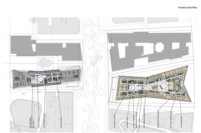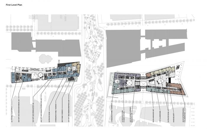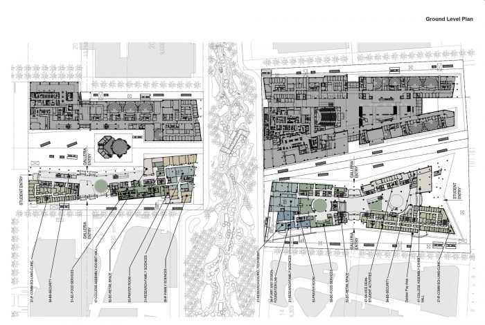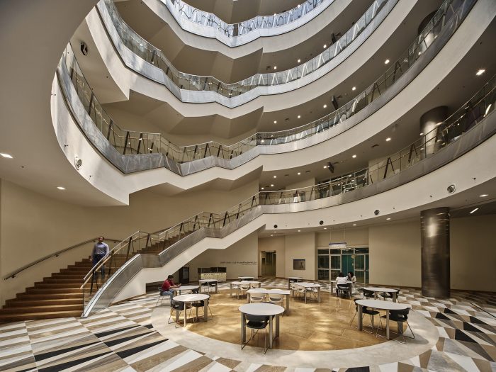 Circulation in the college is organized along two north-south parallel wings that flank the atria. These circulation paths, the college’s intellectual and pedagogical core, intersect the east-west Gallerias that run across the campus linking each college. These intersections form the nexus of COLS’s internal identity. Student life activities are grouped around these nodes, including food service, retail, student clubs, lounges, exhibit halls, and large lecture facilities.