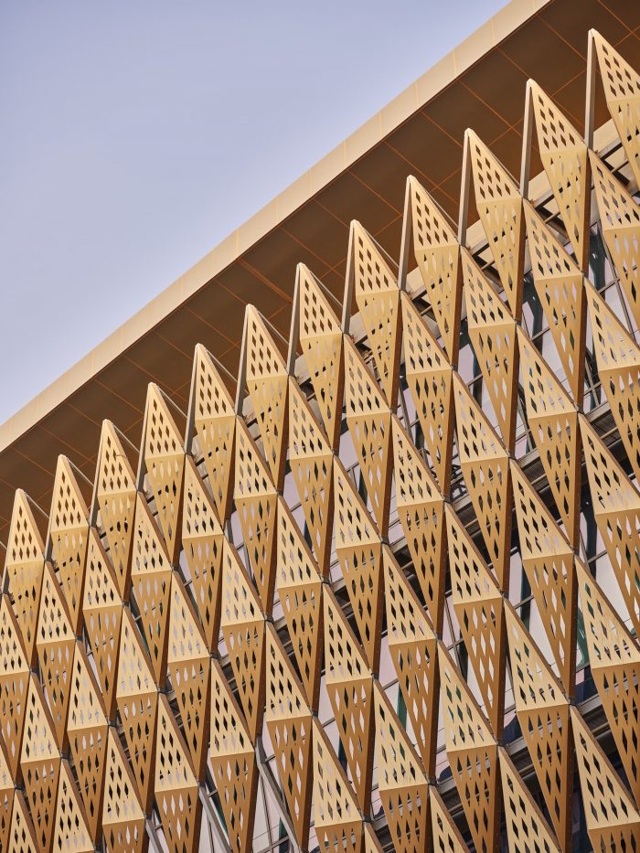 生命科学学院是一个优雅的例子,它结合了项目要求和对特定场地和环境条件的反应,创造了一个独特的、完全适合研究艺术和环境的学院。这座对场地反应特别强烈的建筑,以其引人注目的、有棱有角的倾斜外墙和引人注目的、沙漠色的、有纹理的材料包层而闻名。菱形结构的阵列--穿孔金属板--过滤了自然光,并为室内遮挡了刺眼的阳光。金色结构的颜色强度随着一天中太阳的移动而变化,就像周围的沙漠一样。面板阵列的棱角几何形状与建筑占地面积和周围景观特征相呼应。