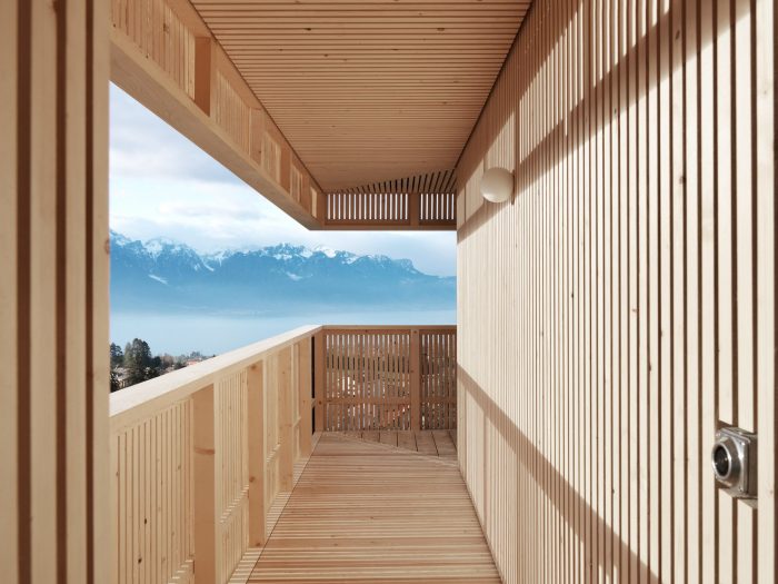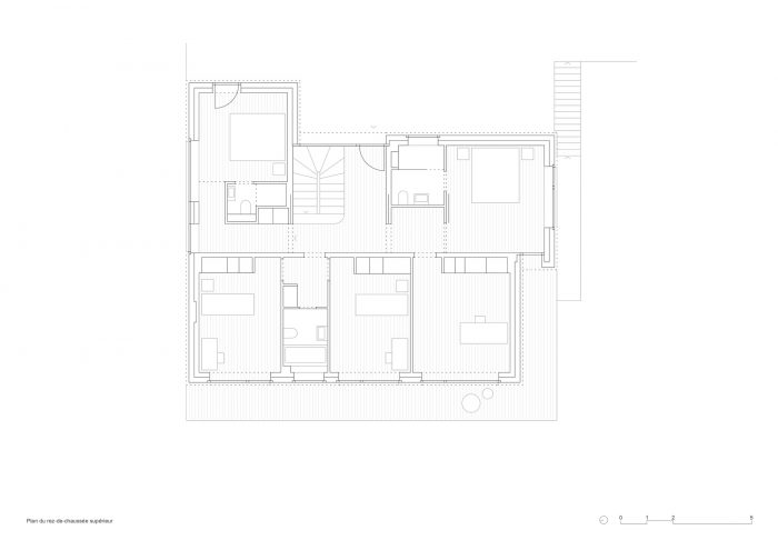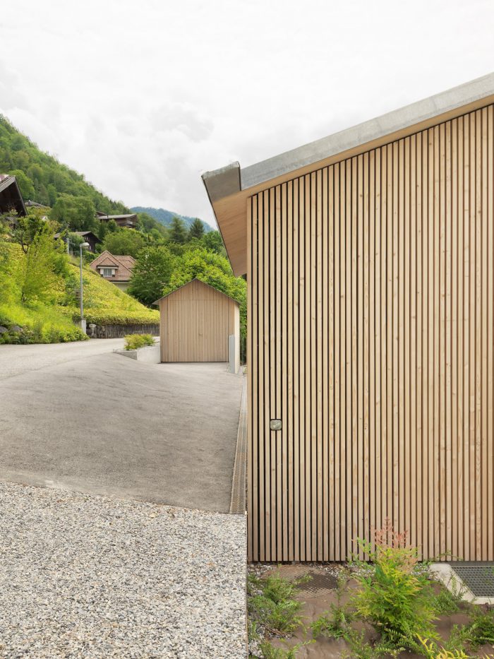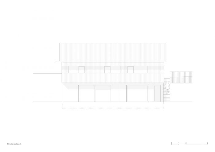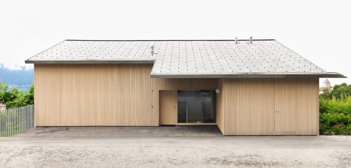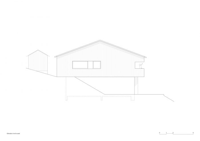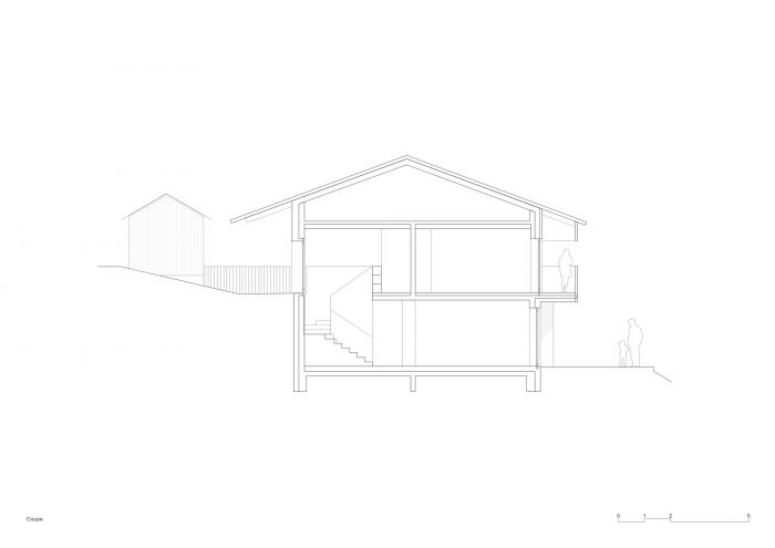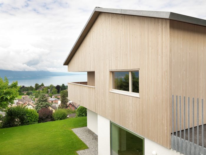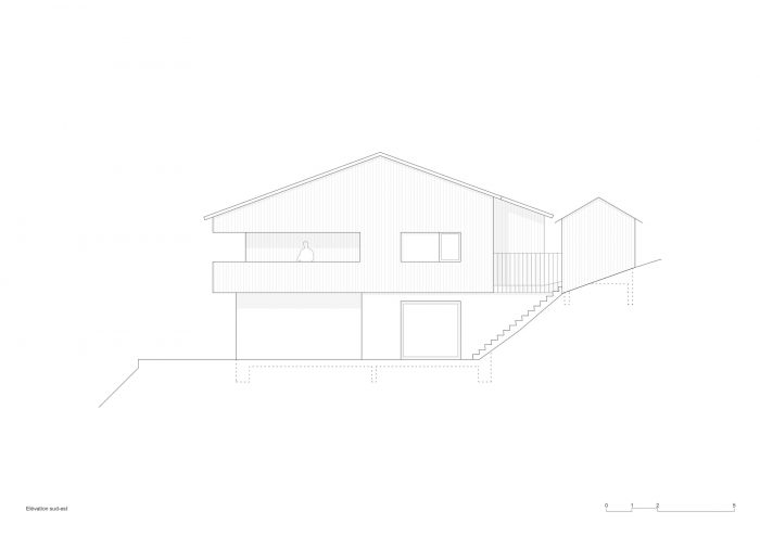 The overall shape of the family house remains unchanged. Only a «skin» composed of vertical wooden cladding envelops the upper ground floor. The cladding finely integrates the various openings while assimilating the existing balcony so that it becomes an extension of the interior spaces much like the deck of a ship. This gives the effect of a wooden box placed on a mineral base anchored into the slope.