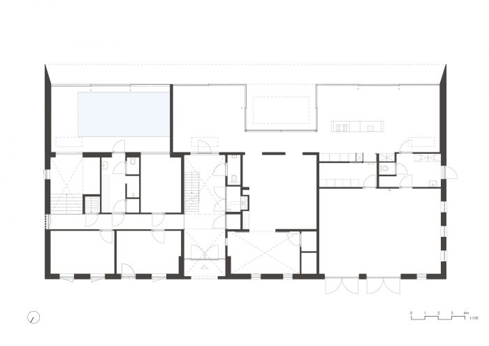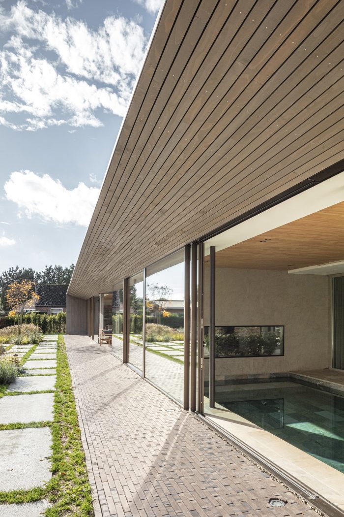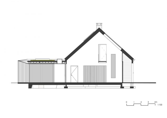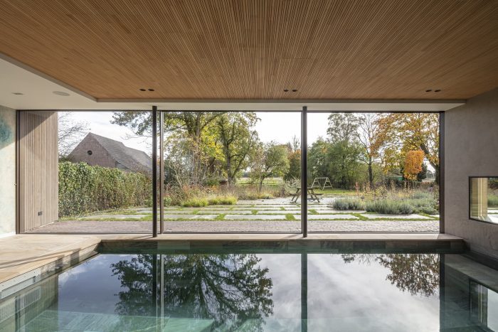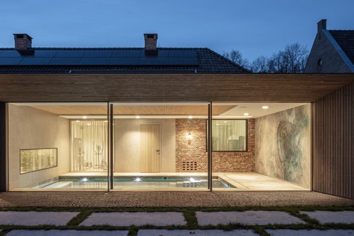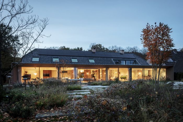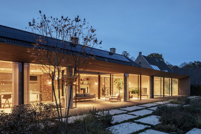 Residents can now choose the enclosed cozy spaciousness of the historic farmhouse or opt for the open connection to the garden. A wide wooden overhang frames the glass facade and provides shade.