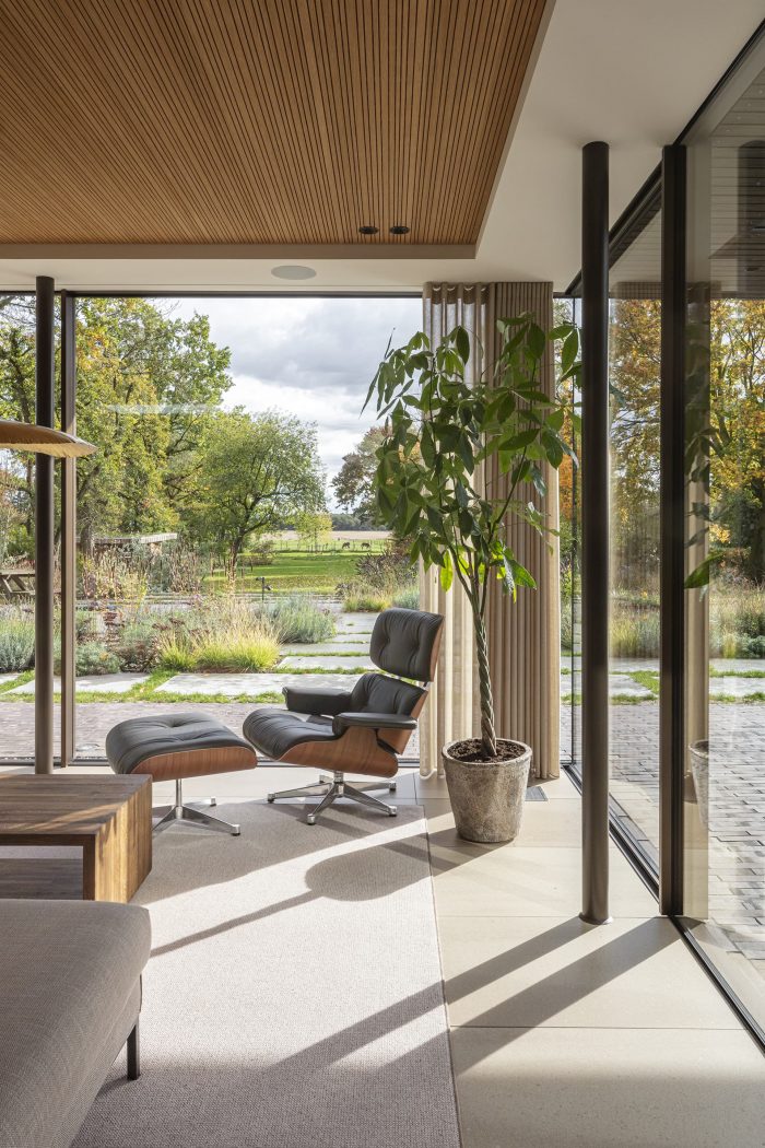 居民现在可以选择历史悠久的农舍的封闭式舒适空间,或者选择与花园的开放式连接。一个宽大的木质悬架框住了玻璃外墙,并提供了遮阳。