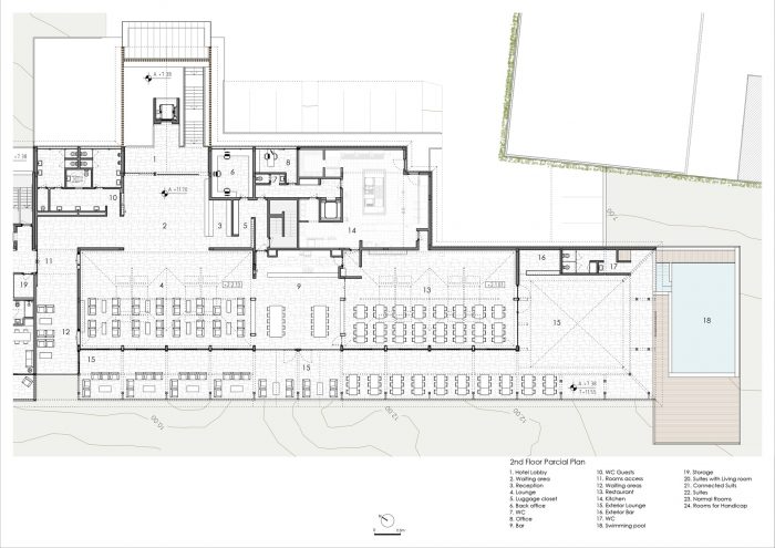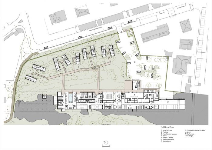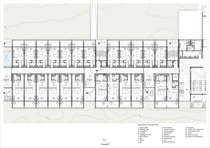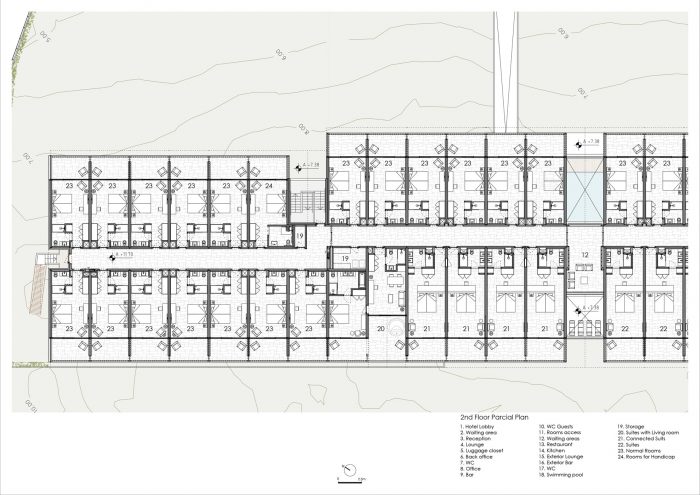 这个想法或建议有一个潜在的简单性,我真诚地希望,正如在简单的事物中经常发现的那样,这将是给当地带来的主要优势,产生其可持续性和与这个想法的可持续关系。我们的目标是创建一个酒店。酒店这个词,并不总是与积极的干预相联系。 多年来,甚至在今天,这个词都与一个有许多房间的大型建筑联系在一起,具有强烈的体积感和成群结队的人进出。酒店是一个临时住所,与我们的主要住所交替使用,由于临时的需要和欲望,如果可能的话是为了休闲。打算中的酒店是一个主要为快乐、休闲、舒适和由不同地点构成的这个地方所提供的生活体验而设计的空间。它不会是一个沿着上述路线的酒店。它将是一个宁静的地方,由几个人居住或停留在不同的空间,能够在不同的社会场所根据其设施和功能与另一个人见面。