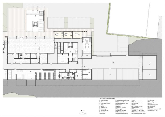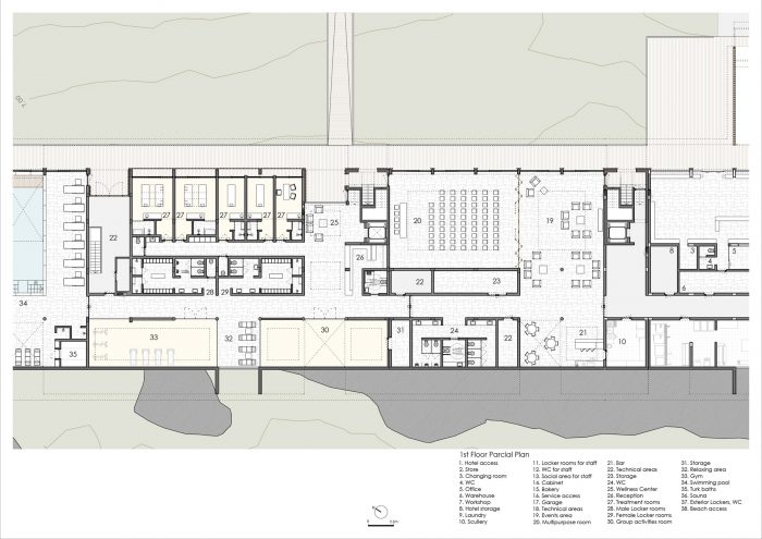 Upon our arrival we encounter the main entrance. The entrance for cars will be restricted to that which is strictly necessary for the unit’s essential functioning. Otherwise the entrance to the hotel will be on foot - obligatory, easy and pleasant. The technical access will be achieved from the road to the south of the unit. The main building, which has the largest volume, will house the technical and administrative services, a restaurant, bar and the large terrace. Taking advantage of the difference in height between the lower elevation of the ground and the higher elevation of the sand dune, a semi-subterranean floor will be created for technical functions. The social and meeting spaces for guests will rest upon the sand dune itself, making it possible to gaze out to sea, enjoy the sunset, and feel the wind.