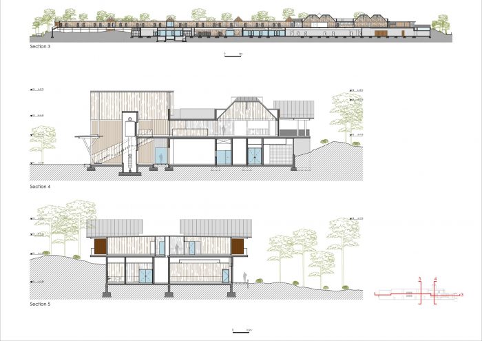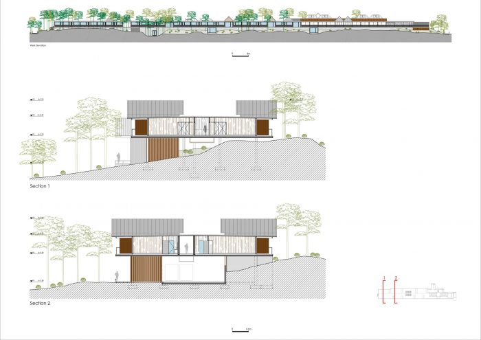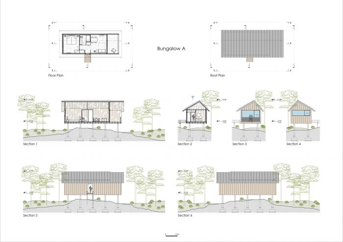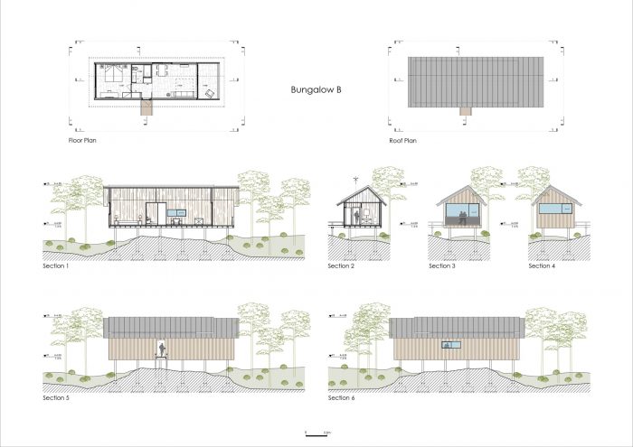 The materials to be used are already found in the locale – i.e. natural materials. Wooden constructions, assembled in the locale, adapted to the lie of the land, existing features, as if pre-planned. The materials to be used will be primarily wood, some glass, enabling the interior to extend into the exterior, and ensuring that the exteriors form an integral part of the interiors, offering comfort and privacy. The copper-sheet roof coverings guarantee waterproofing and above all will generate a natural colouring, that over time will draw closer to the existing natural colours. Other key materials are the existing expanses of green, all of which are to be maintained.