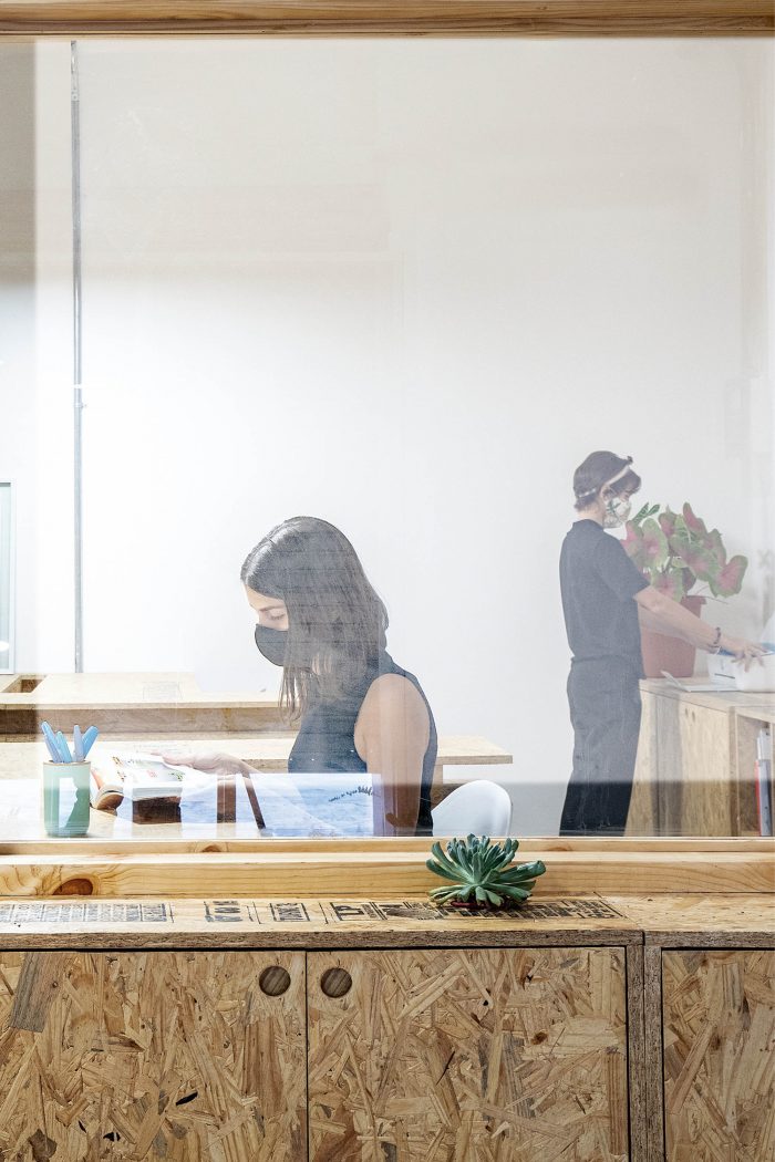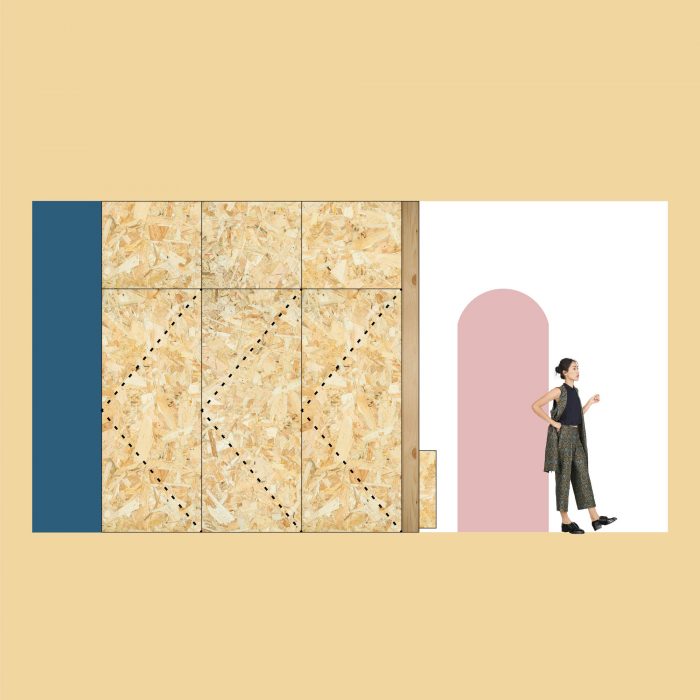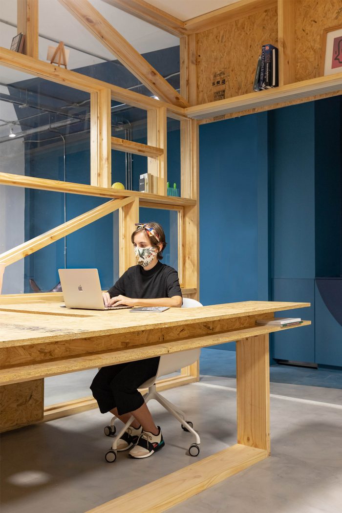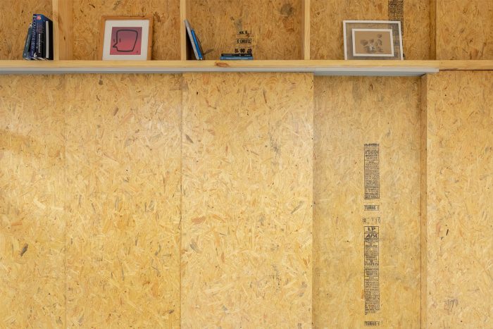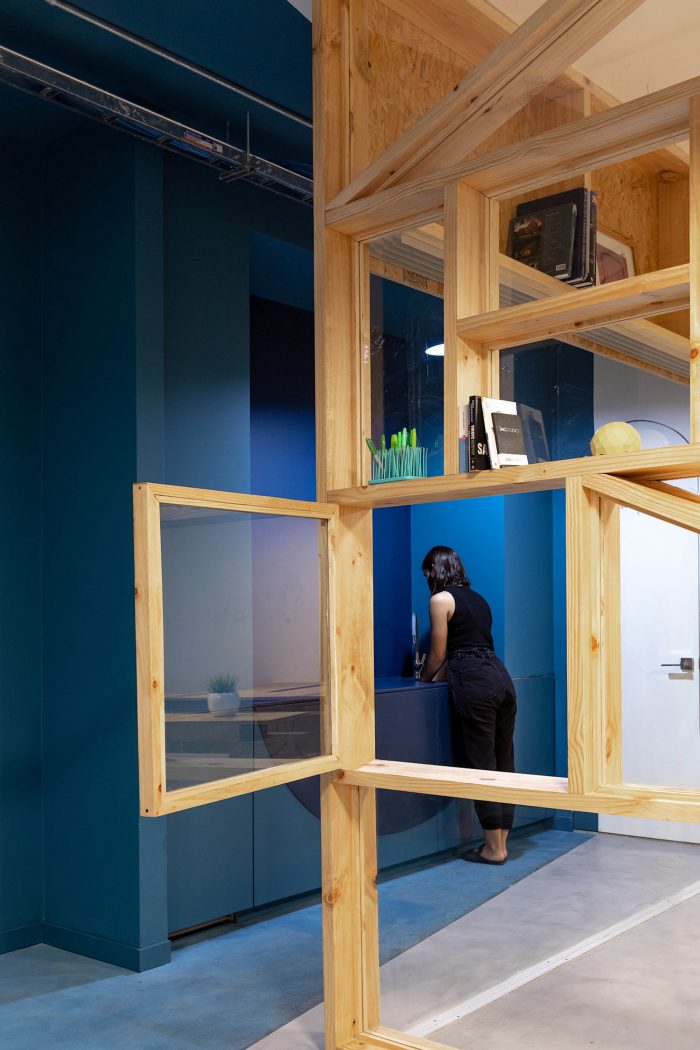 The materials used are mainly pine wood and coloured lacquered wood. The reticulated shelf is made of pinewood boards (19 x 9 cm) with a system of dowels and white glue, in addition to different elements and partitions with OSB boards. The floor is finished with cement and a layer of sealant, the ceiling installations are exposed.