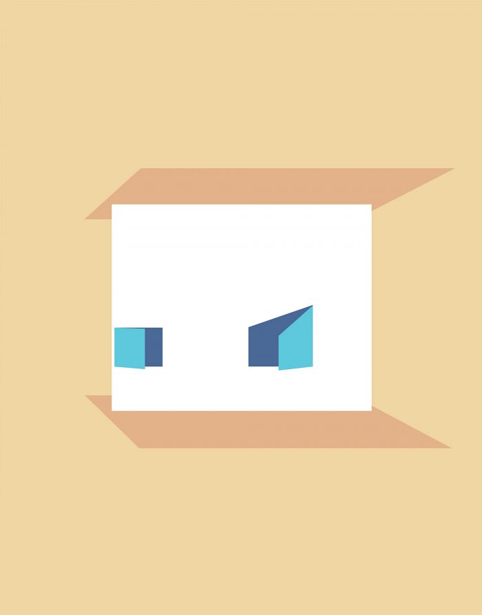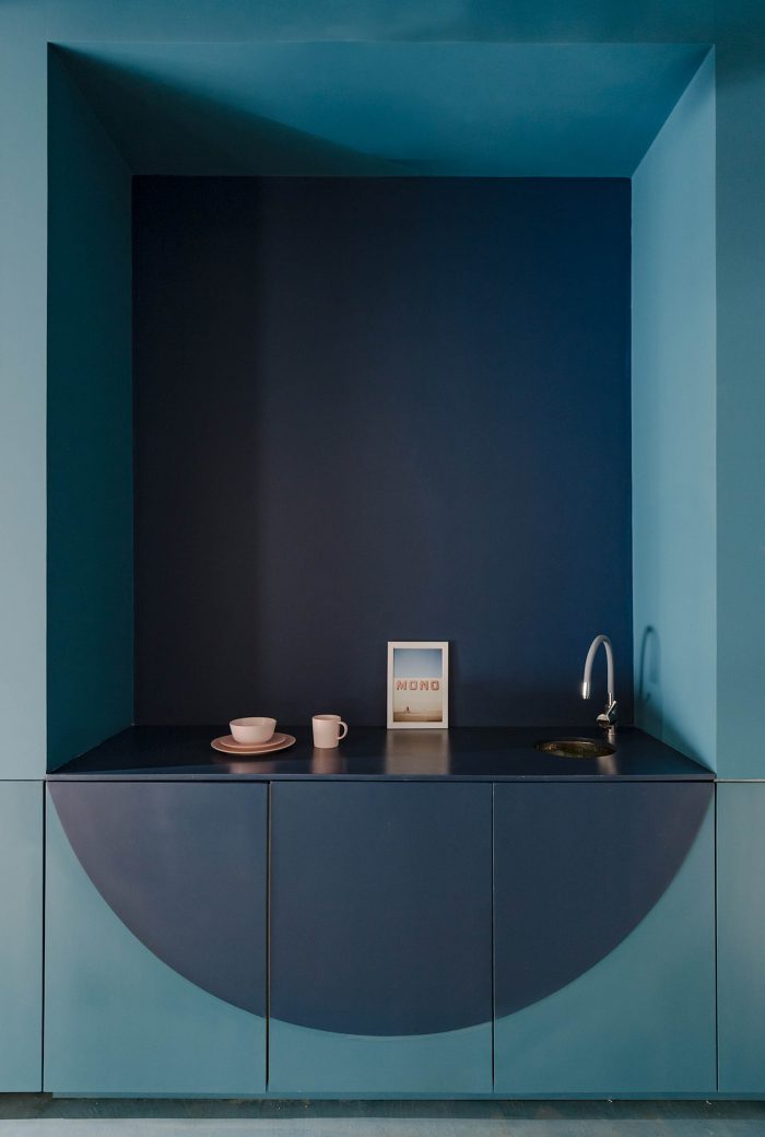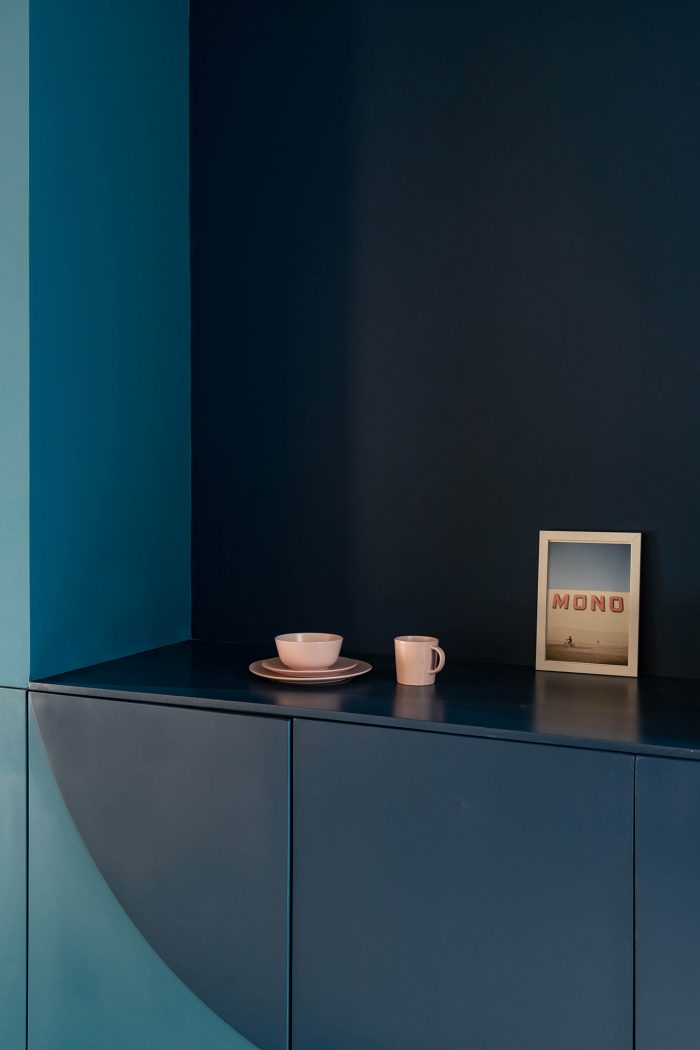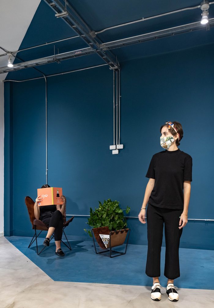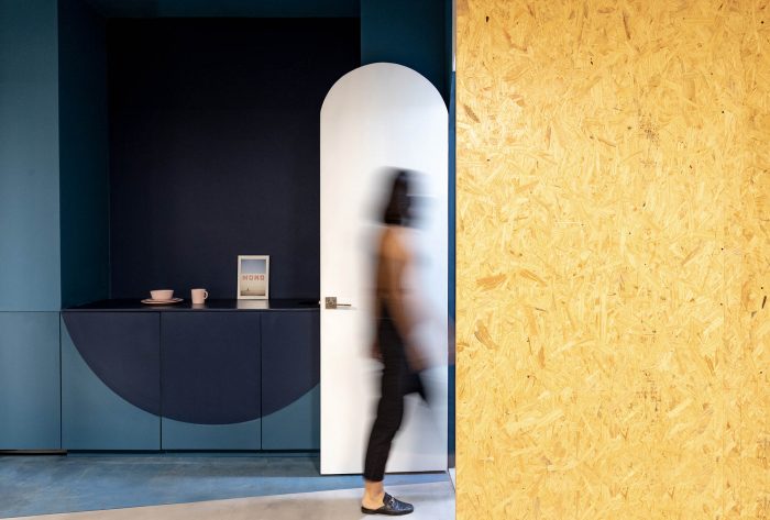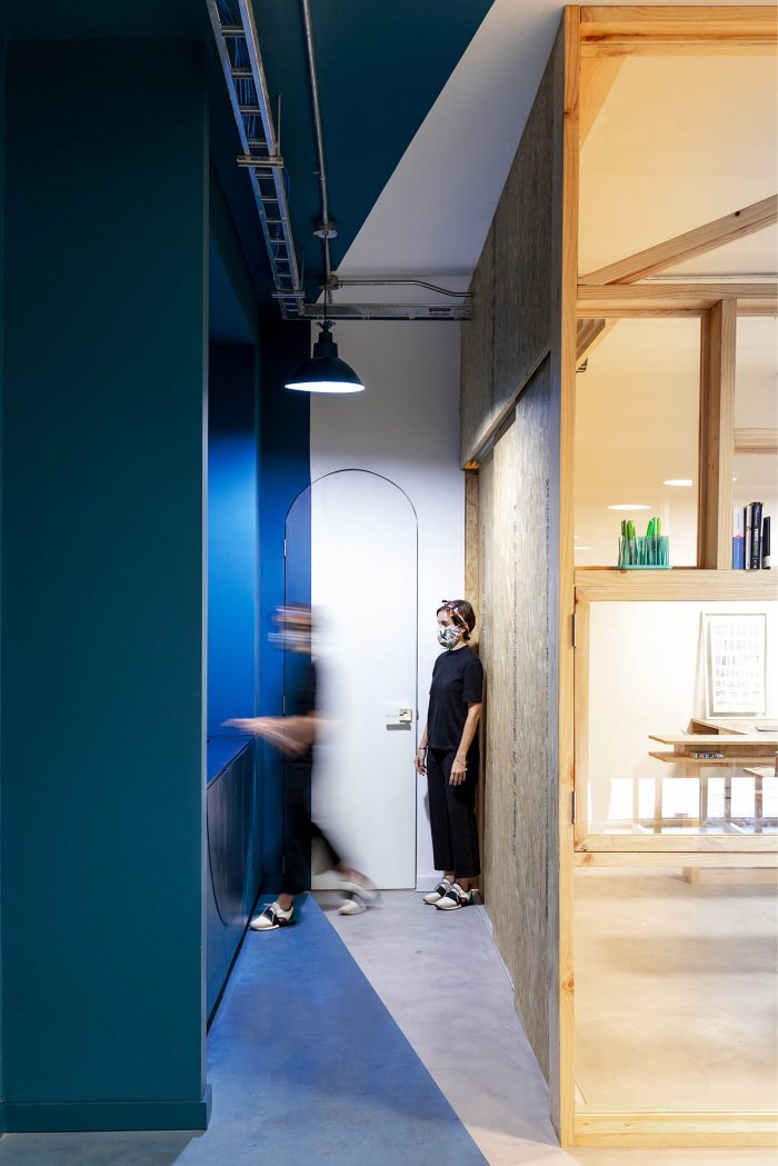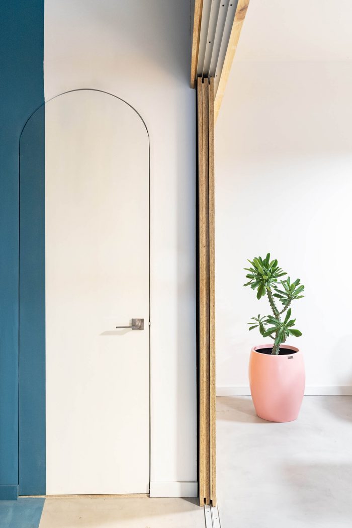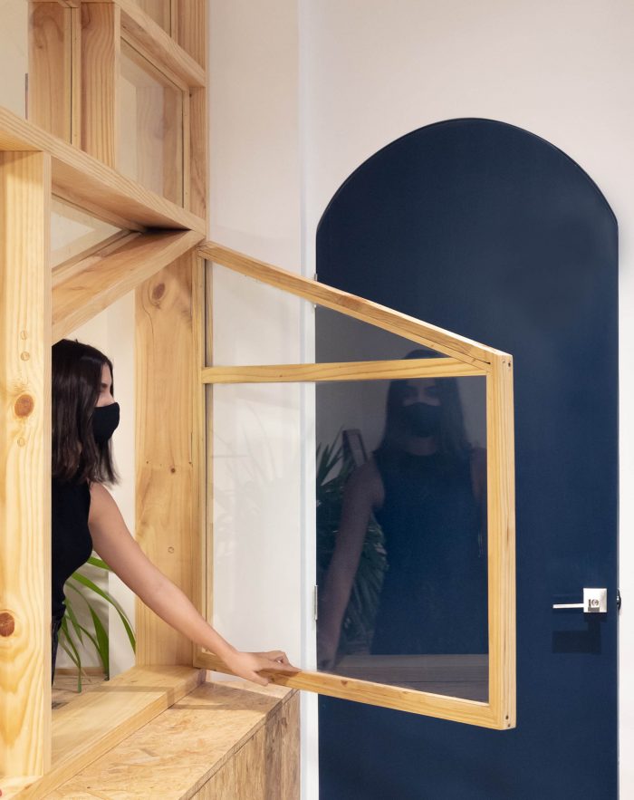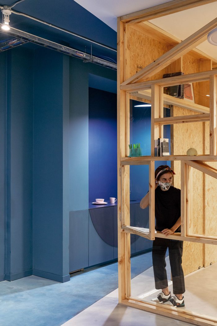 The use of colours, shapes and materials has been simplified as a resource to create a hierarchy between areas: choosing Pantone blue 2020 and curved lines for the service container and white, natural wood and orthogonal lines for the new spatial intervention.