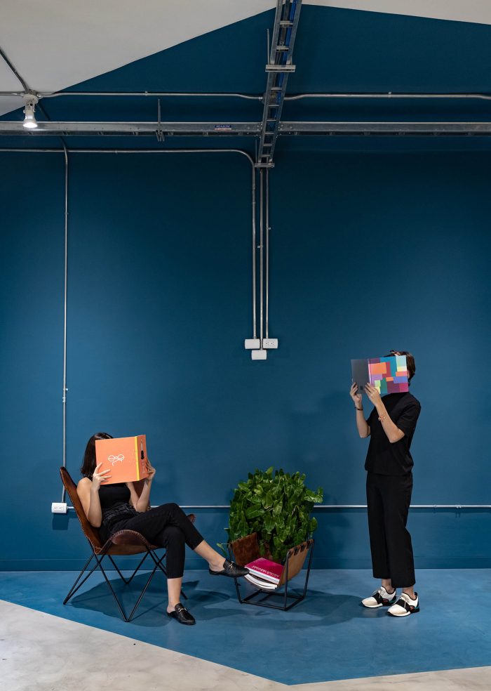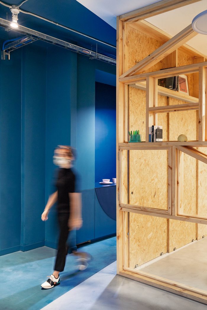 颜色、形状和材料的使用被简化为一种资源,以创造区域之间的层次感:为服务容器选择潘通蓝色2020和弧形线条,为新的空间干预选择白色、天然木材和正交线条。