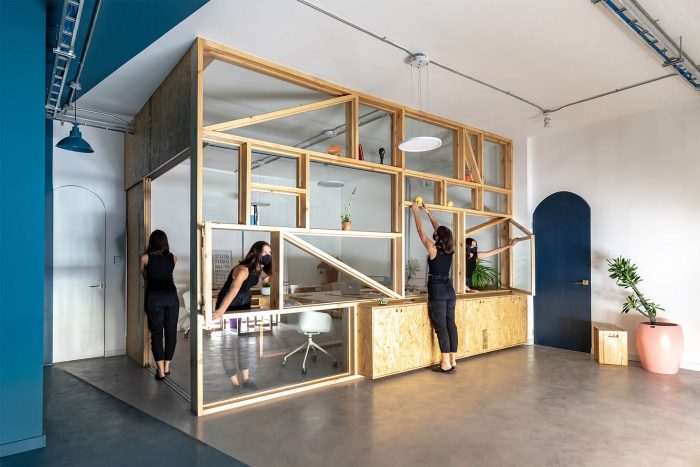 The main objective of the project was to design a completely flexible space for the new needs of the client, therefore, the starting point of this proposal was to study the possible uses of the space. The working dynamics were analyzed, and a decision was made to create an office and sales location with different levels of privacy. The spatial project that houses the new office consists of an open floor plan, ordered with the introduction of a reticulated shelf that distributes the office spaces, bathroom, cafeteria bar, showroom and production area, as well as work and meeting spaces.