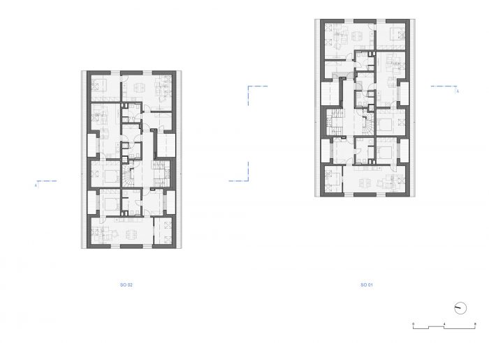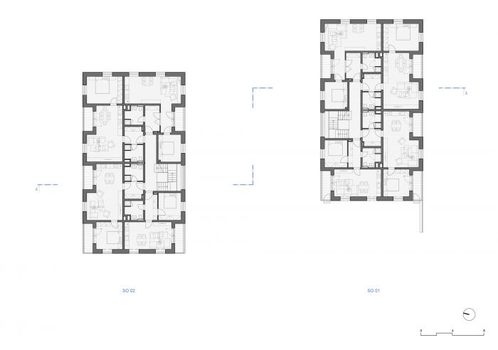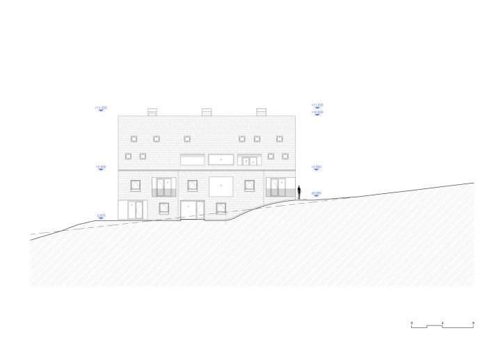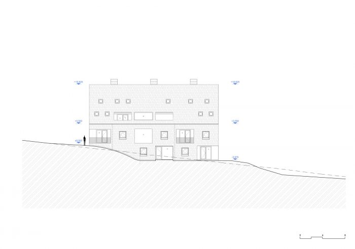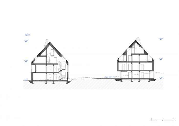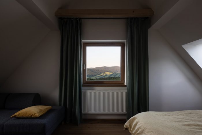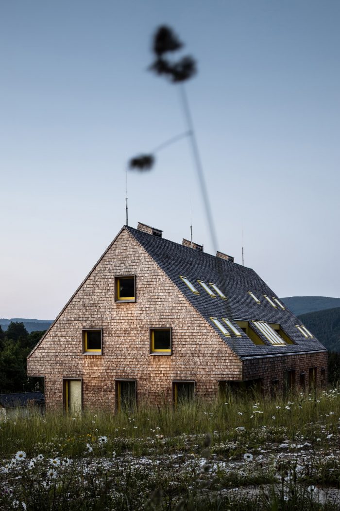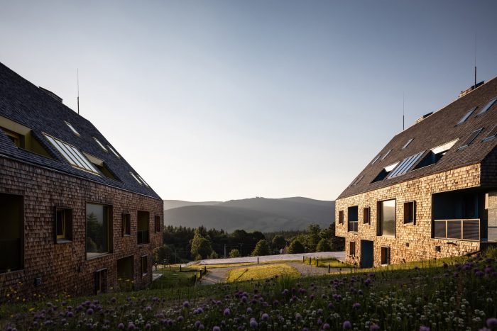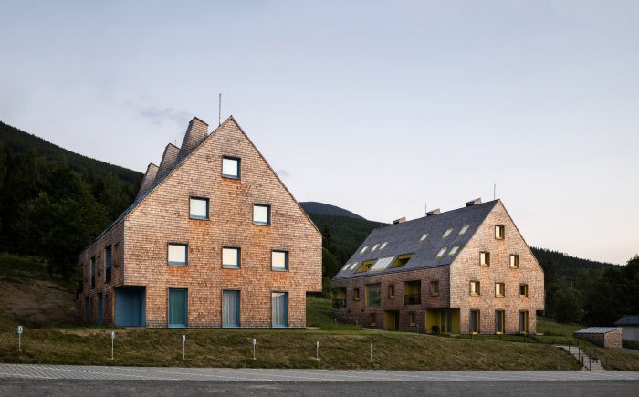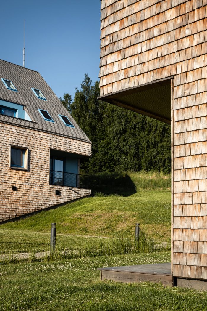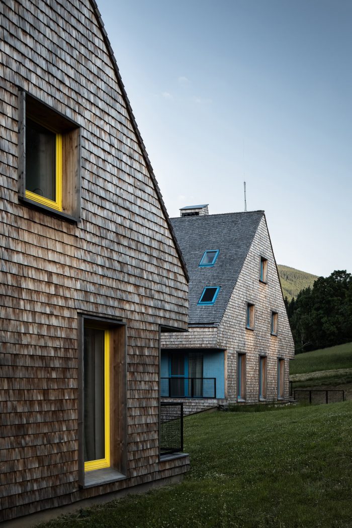 The contemporary, almost minimalist simple concept of the buildings is a freestyle transcription of the traditional morphology of the original architecture of Jeseniky. The classic gable roof completes the basic mass on the rectangular foundations. Both buildings are completely clad with a typical material of local origin – larch shingles in the natural design.