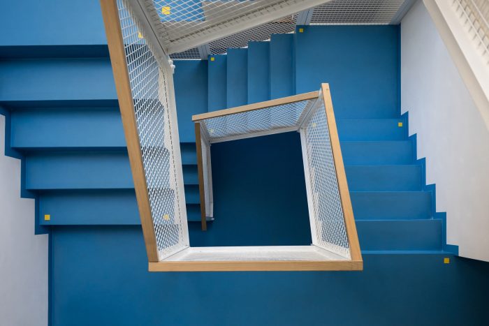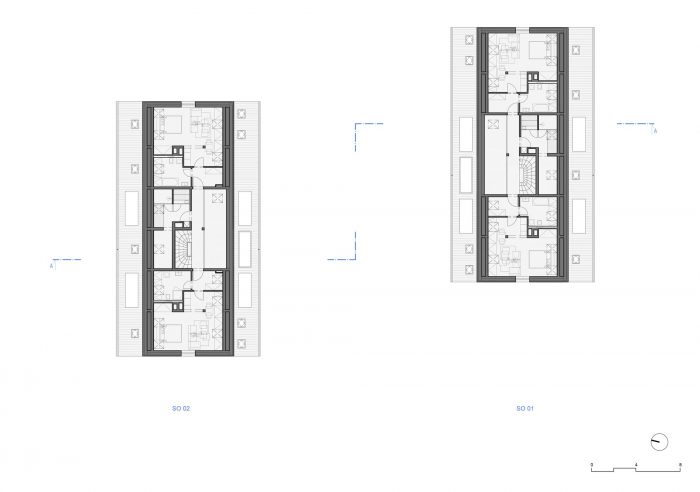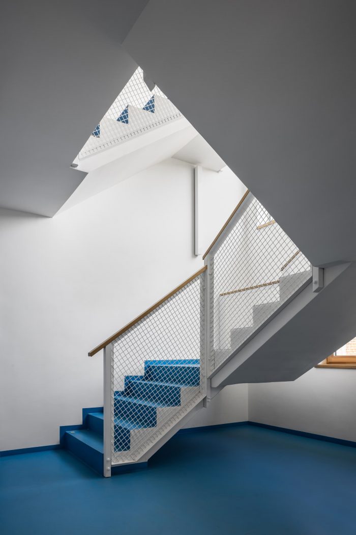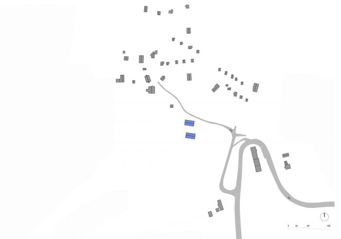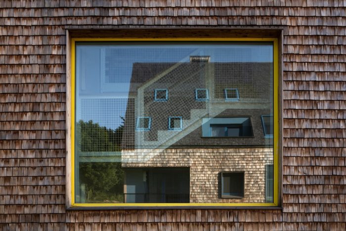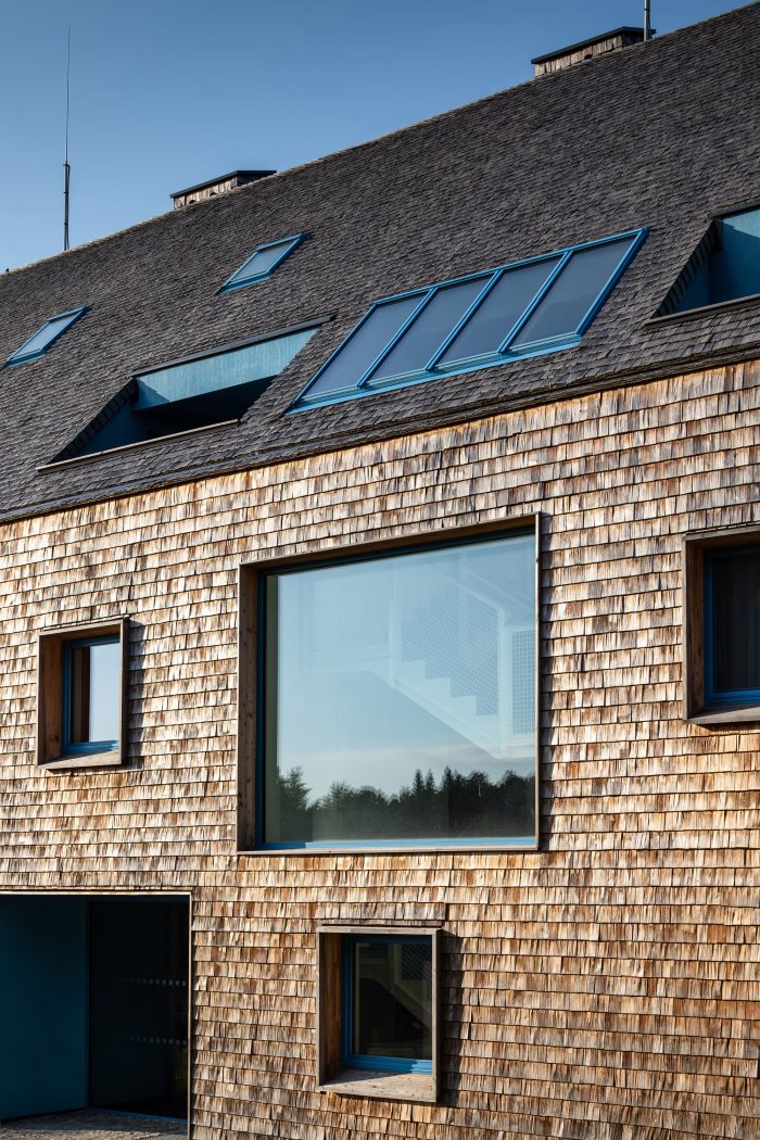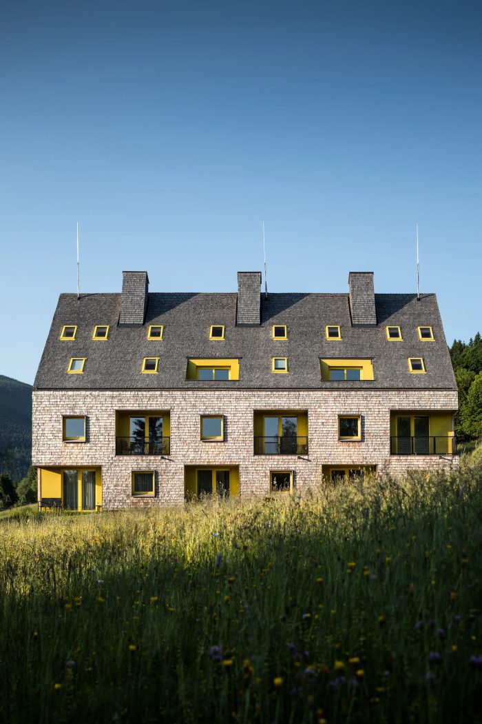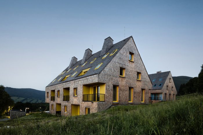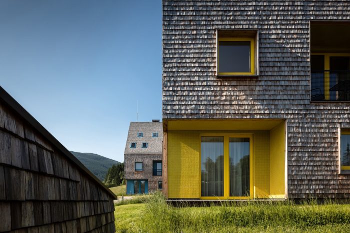 The design relies on traditional materials – the wooden cladding of larch shingles from the local forest, which is a free paraphrase of the facades of local barns, and gabels of residential buildings. Colored loggias are set in contrast to the naturally greying cladding, adding a colorful accent and vibrancy to the buildings.