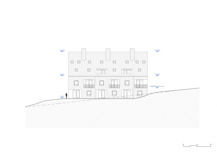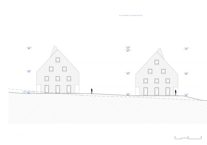 The residential parts are designed as sand-lime brick walls with reinforced concrete monolithic ceilings, and the roof is a wooden gable construction. The building stands on a strip foundation.