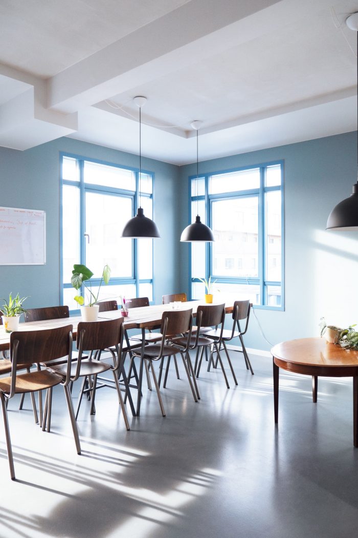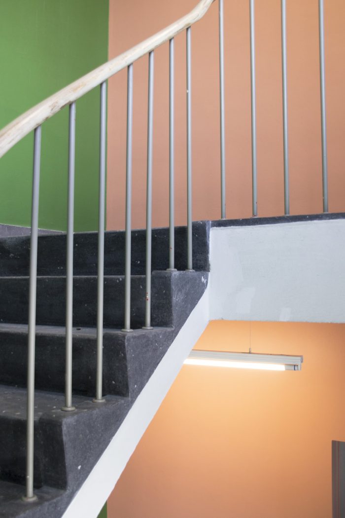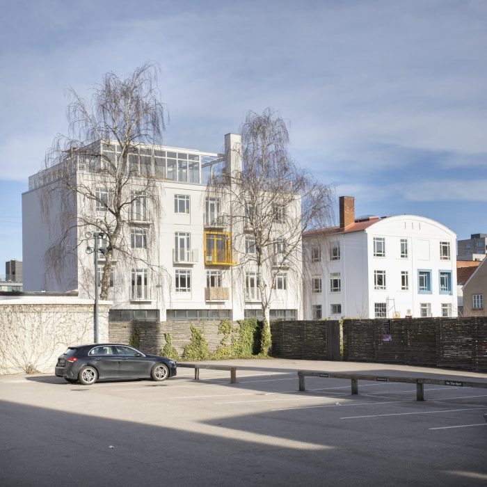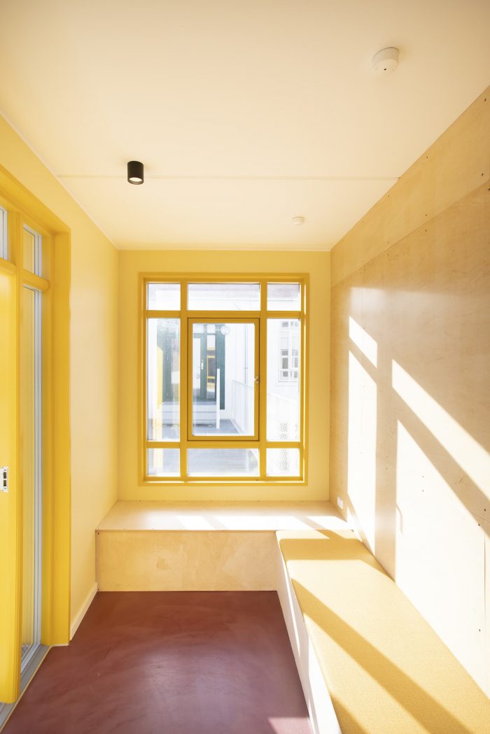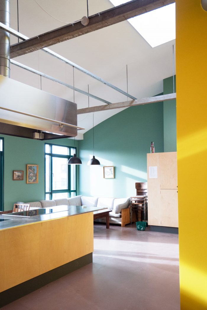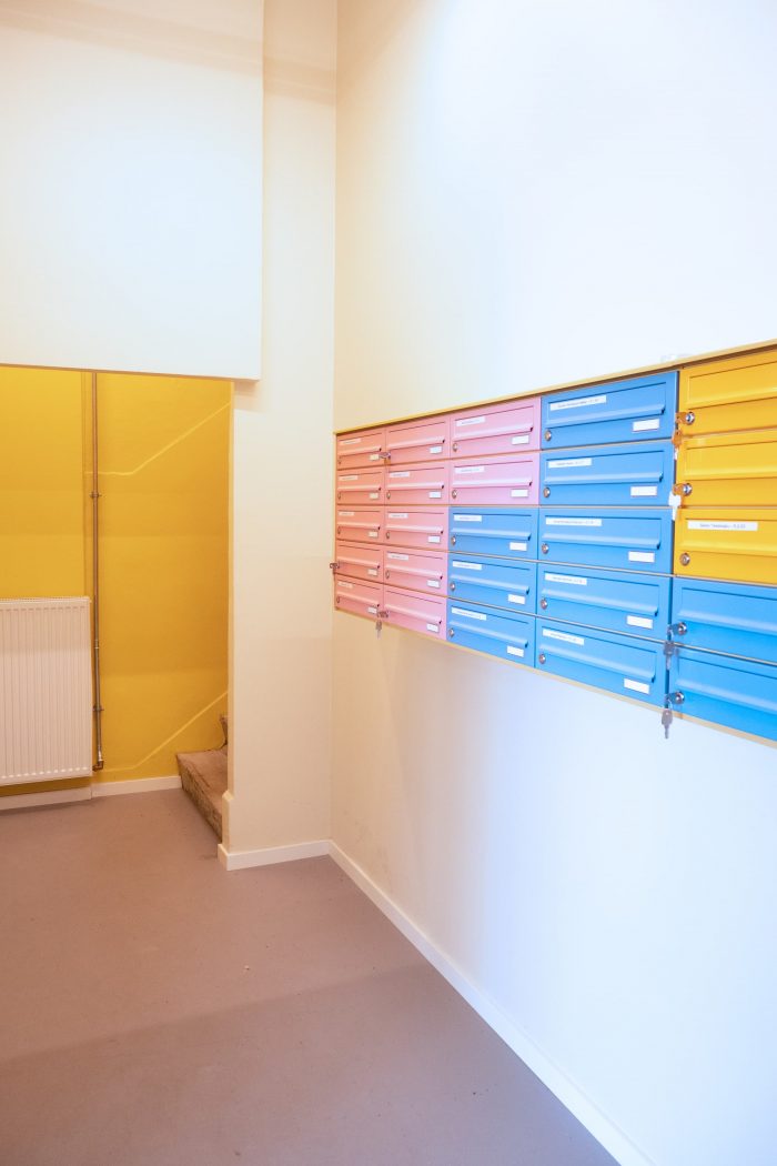 This architectural personality is realized through Spacon & X’s more human scale and somewhat backward approach. The studio, after starting out in 2014, has created award-winning interior projects and was named Dezeen’s Emerging Interior Designer of the Year in 2018, with Filmlageret now being their first completed building as lead architects. Their approach to smaller scale projects is seen at Filmlageret where there is a preservation of small details from the old building that maximizes the character of the architecture, which Spacon & X refer to as “loving the kinks”, and a highly tactile interior experience. This inside-out approach is also seen where the colors of the interior common spaces spill out onto the white exterior.
