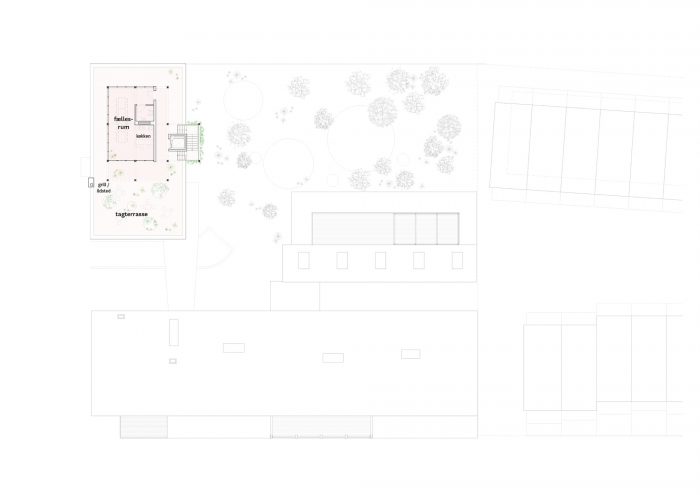 Filmlageret, named after the site’s previous function as a film storage facility, consists of 37 compact living spaces of differing sizes in the renovated building; 9 apartments in the new build; 10 shared spaces spread throughout, including a roof-pavilion and terrace; smaller social niches; spaces for 3 or 4 commercial activities on the ground floor; a communal courtyard; and a semi-underground car park.