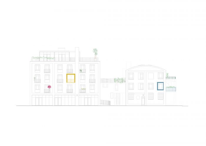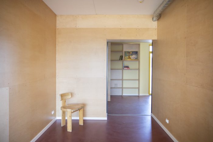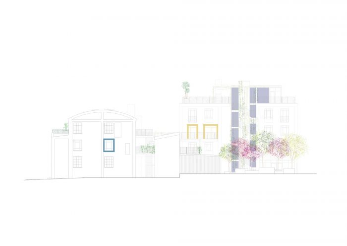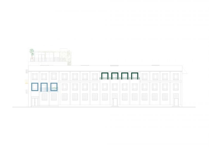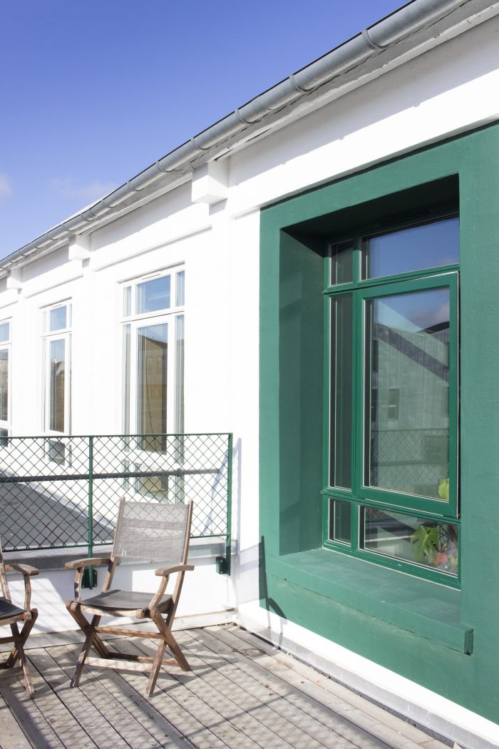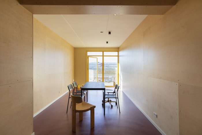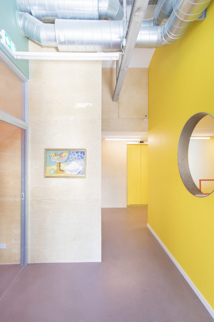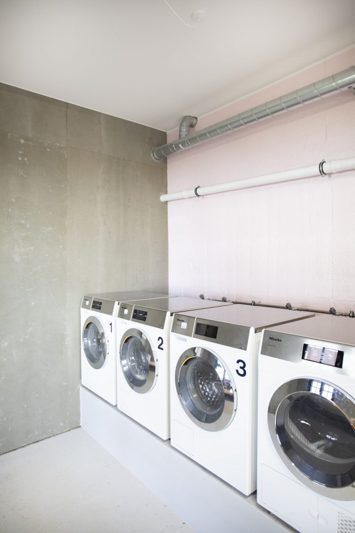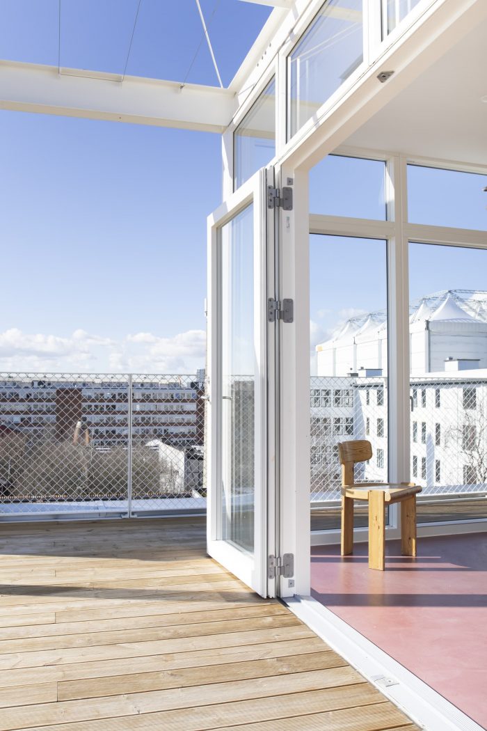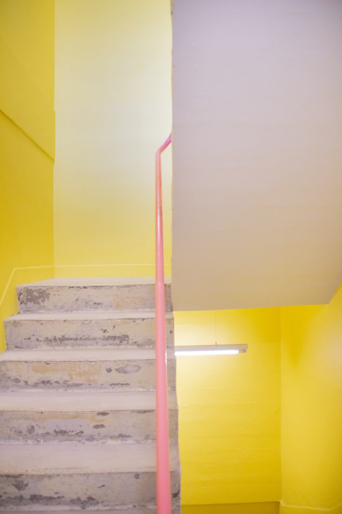 This architectural personality is realized through Spacon & X’s more human scale and somewhat backward approach. The studio, after starting out in 2014, has created award-winning interior projects and was named Dezeen’s Emerging Interior Designer of the Year in 2018, with Filmlageret now being their first completed building as lead architects. Their approach to smaller scale projects is seen at Filmlageret where there is a preservation of small details from the old building that maximizes the character of the architecture, which Spacon & X refer to as “loving the kinks”, and a highly tactile interior experience. This inside-out approach is also seen where the colors of the interior common spaces spill out onto the white exterior.