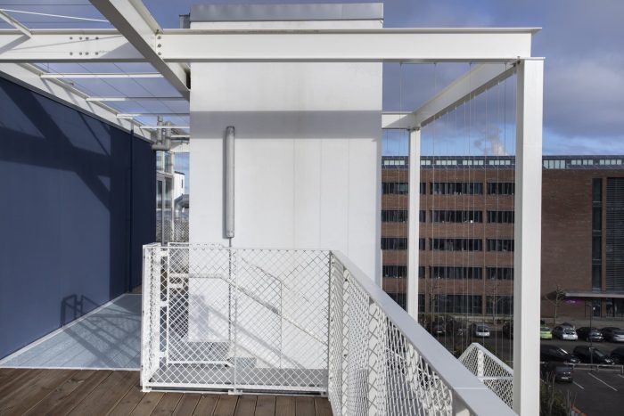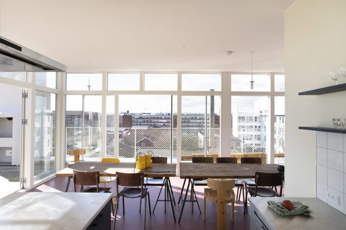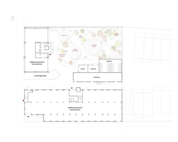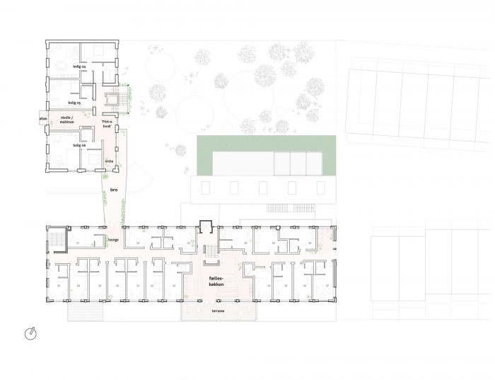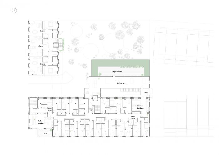 Filmlageret, named after the site’s previous function as a film storage facility, consists of 37 compact living spaces of differing sizes in the renovated building; 9 apartments in the new build; 10 shared spaces spread throughout, including a roof-pavilion and terrace; smaller social niches; spaces for 3 or 4 commercial activities on the ground floor; a communal courtyard; and a semi-underground car park.