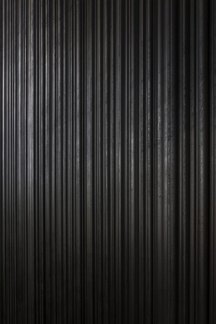 The pattern introduces a smaller scale to the large scale facade surface. The relief is visible only when you walk near the wall making the approach of the building interesting. To optimize the building costs, the concrete has basic aggregate and typical Portland cement. The concrete was colored with 6 % black Bayferrox pigment produced by Lanxess. The surface was treated with black Faceal Color varnish to make the black surface more intense and to blend the building to its surroundings.
