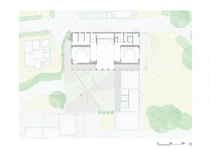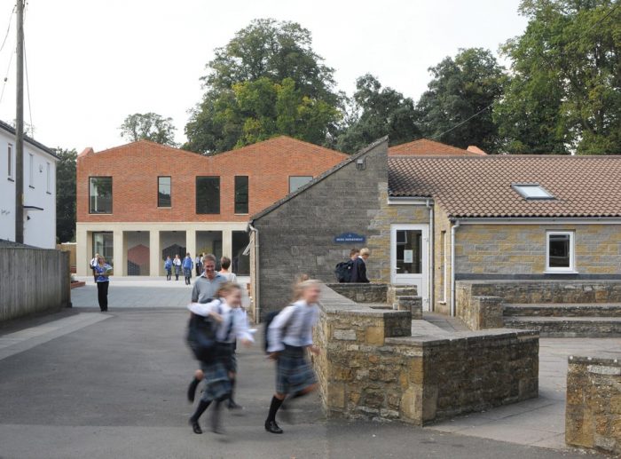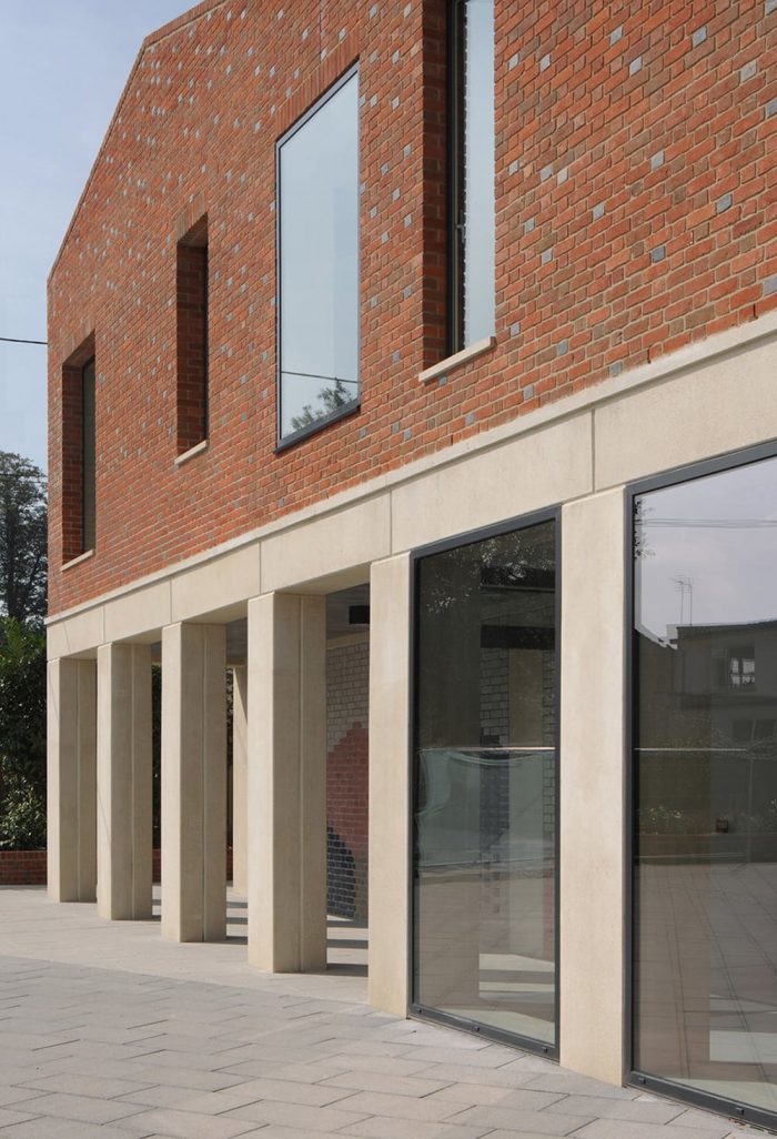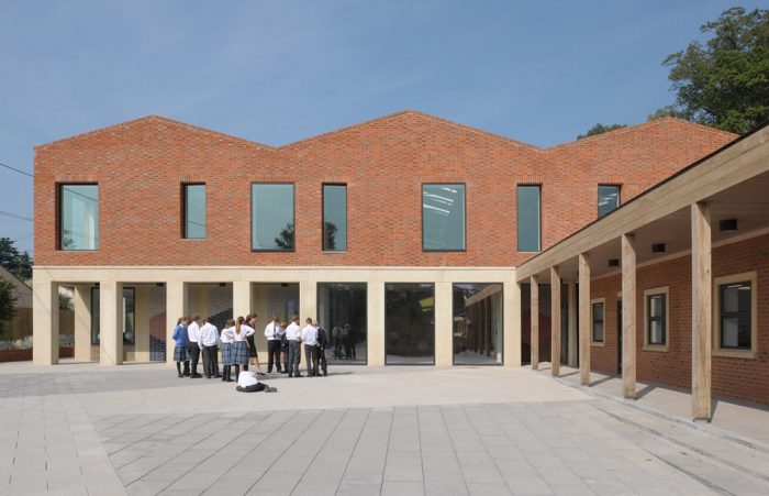 The building is designed in a contemporary idiom, in a style and materialisation harmonious with the original school building. Adopting a classical formality, the façade aims to establish a civic presence and emphasise the role of the courtyard in front. Its sequencing of entrance courtyard and colonnade has a precedent in iconic buildings of the past including Schinkel’s Altes Museum. The new timber canopy to the Woodlands block and pre-cast colonnade of Fitzjames provide covered external break-out space whilst bringing a sense of unity and civic presence to the courtyard. Materially, tones and textures of the building reference the existing, handsome red brick walls flanking Hazlegrove House.