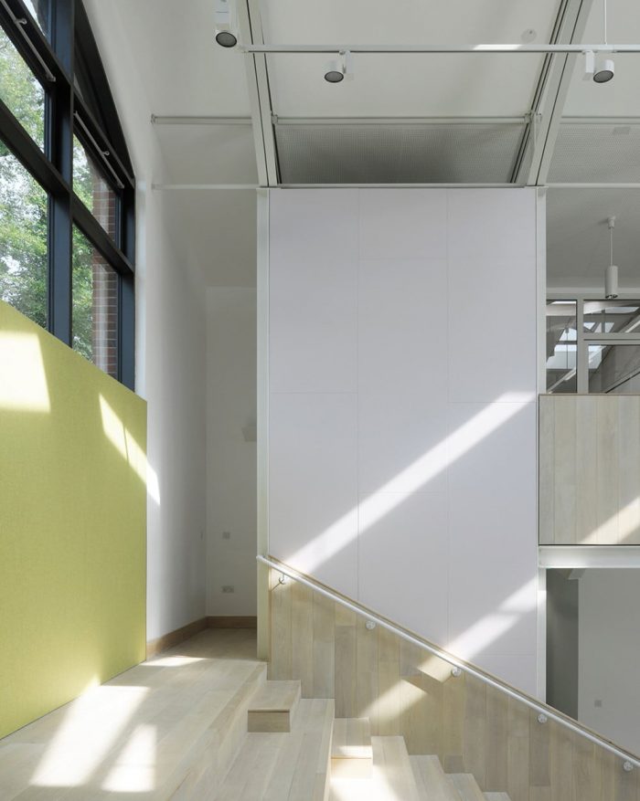 The flexible spatial configuration, degree of visual transparency and acoustic control combine to ensure a successful balance between more traditional classroom environments and the open resource space. Fitzjames makes a strong contribution to improving accessibility on the site, replacing six inaccessible temporary classroom blocks with a fully accessible six-classroom facility. A new courtyard also mediates site levels to adjacent teaching blocks and to the adjoining Woodlands building, defining a cornerstone to the academic school campus.