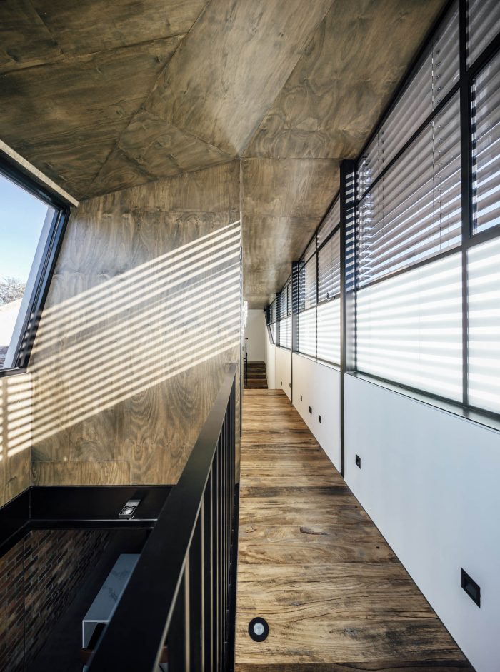 住宅的私人空间被 "藏 "在房子的其他部分,利用所有可用的空间,创造出一种分离和隐私的感觉。在上层,两个独立的卧室区通过一个楼梯连接起来,并有一个开放的走道连接到屋顶的阳台。下层利用天窗将光线引向房屋深处,为主浴室创造了一个宁静的氛围,并从浴室里提供了一个戏剧性的天空景观。