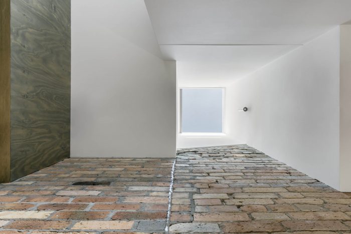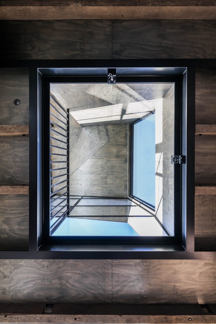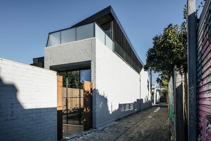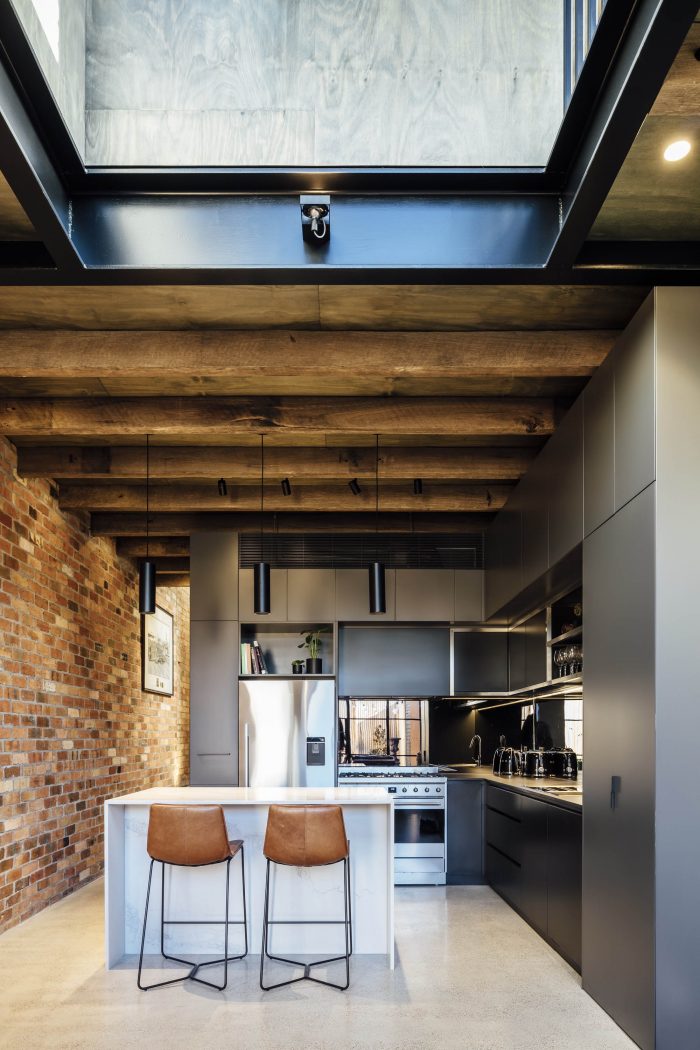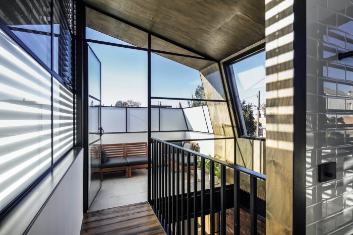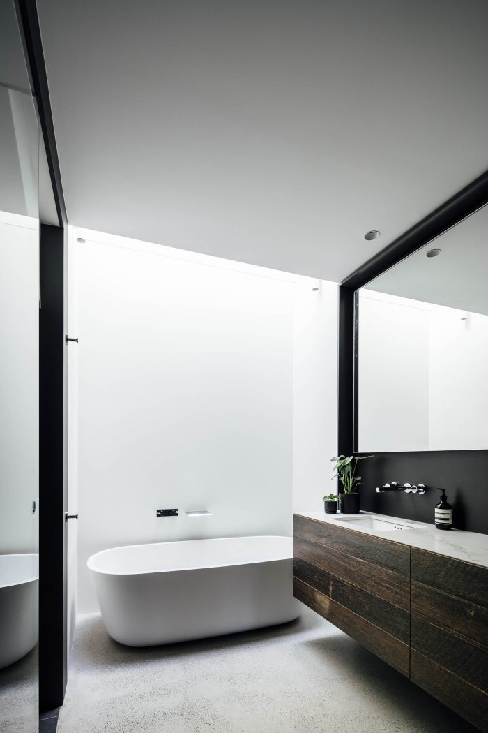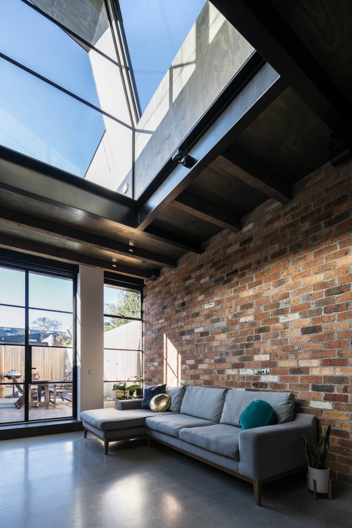 The homes private spaces are ‘tucked’ into other parts of the house, making use of all available space and creating a sense of separation and privacy. At the upper floor, two separate bedroom zones are connected via a staircase, and an open walkway linking across to a rooftop balcony. The lower level utilises skylights to draw light deep into the house, creating a serene ambience to the master bathroom and providing a dramatic view of the sky from the bath.
